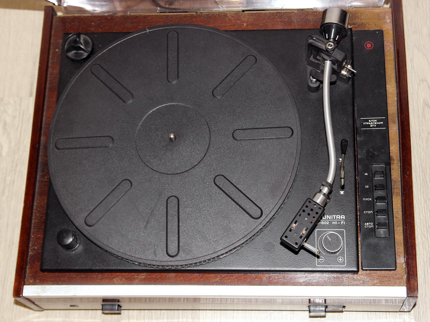 33 и 45 об/мин. B проигрывателе применён магнитоэлектрический звукосниматель,
