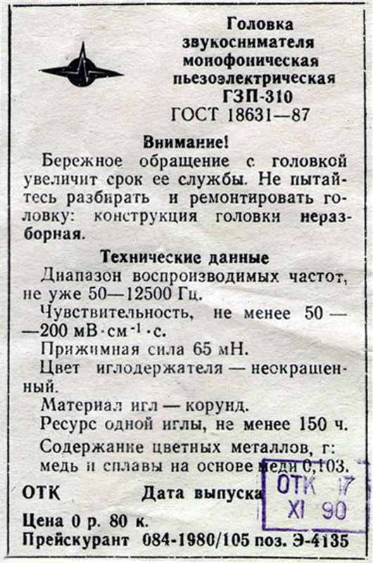 Головка звукоснимателя монофоническая пьезоэлектрическая "ГЗП-310" выпускалась предположительно с 1988 года Ярославским радиозаводом. ГОСТ 18631-87.