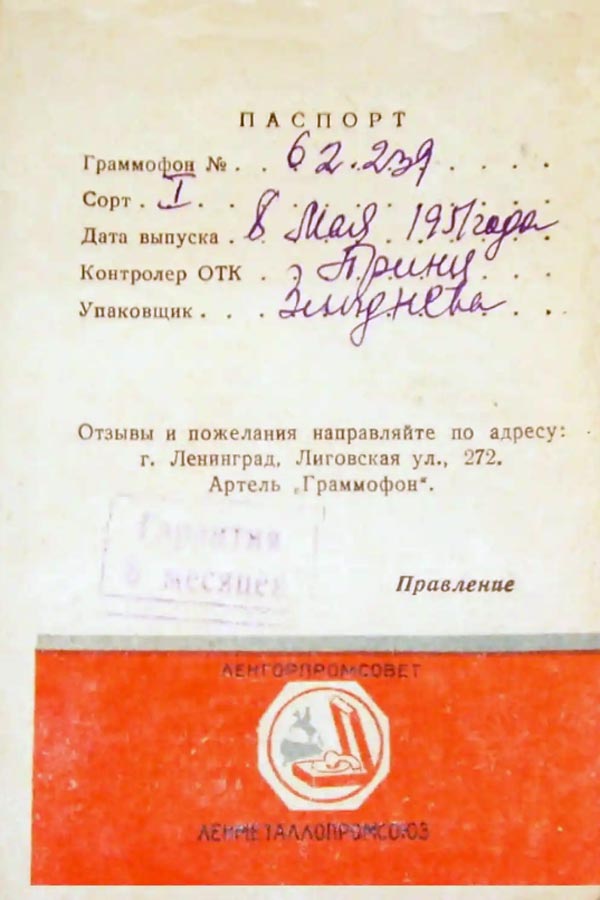 в г. Ленинграде артелью "Граммофон" возможно с 1950 по 1951 год.