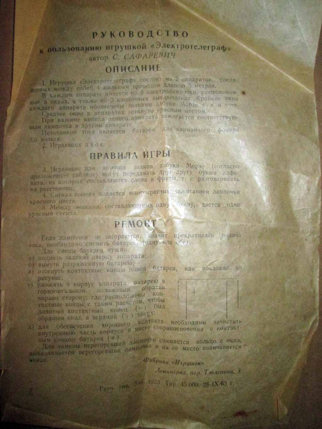 Игрушка "Электротелеграф" производилась предположительно с 1963 года Ленинградской фабрикой игрушек. Игрушка предназначена для переговоров 2-х играющих до 5 метров телеграфными знаками "Морзе".