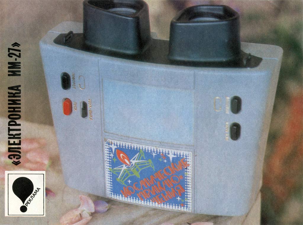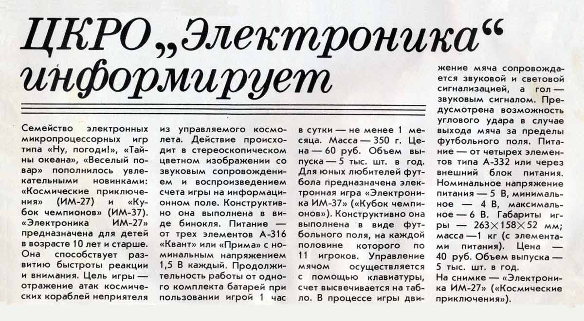 Электронная микропроцессорная игра "ИМ-27" (Космические приключения) выпускалась с 1990 года. Предназначена для детей от 10 лет и старше. Цель игры - отражение атак космических кораблей неприятеля.