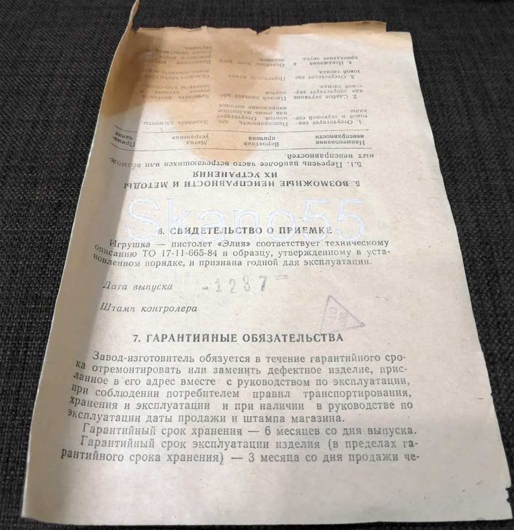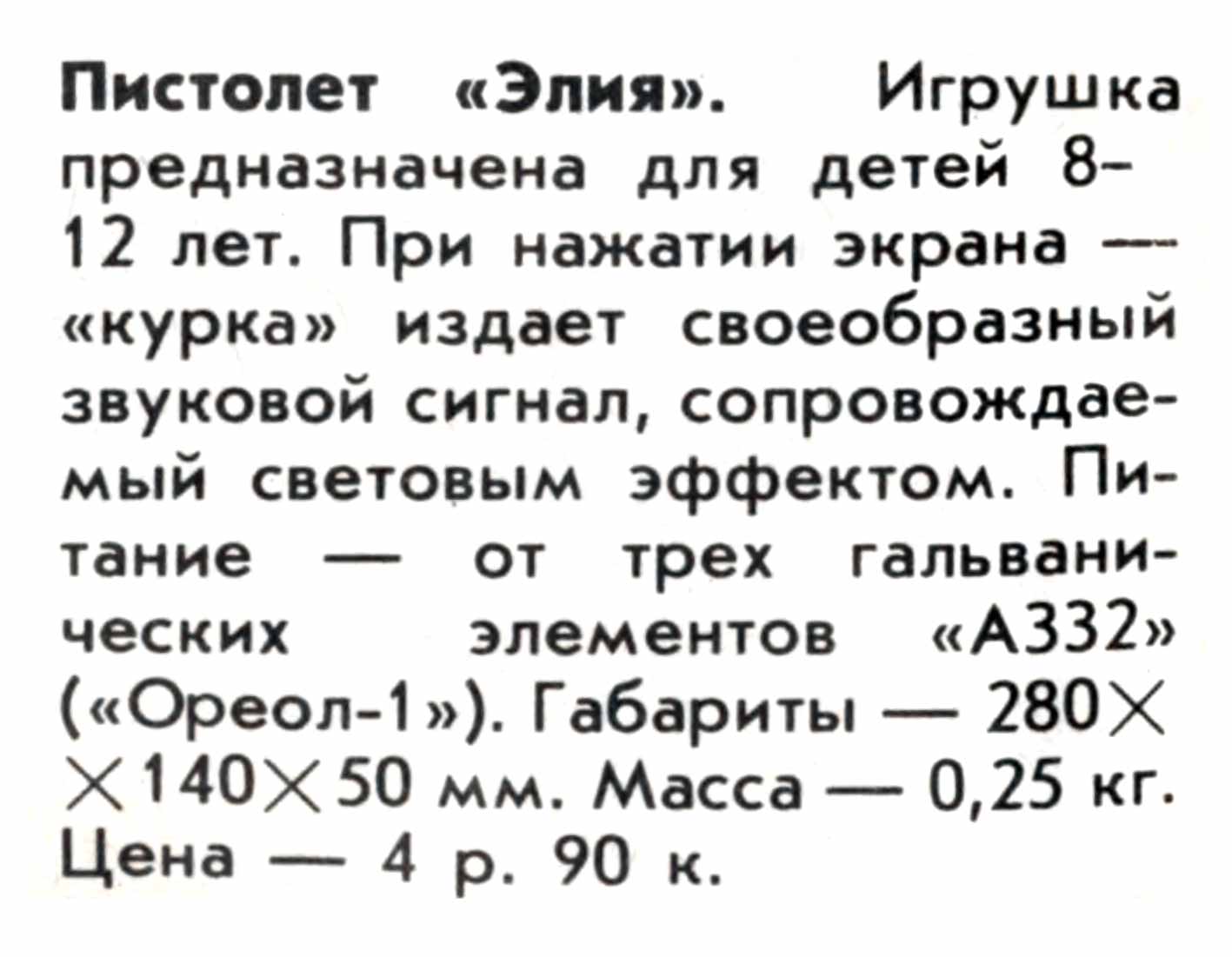 Игрушка - пистолет "Элия" выпускался предположительно с 1987 года Нальчикским заводом полупроводниковых приборов. Световой и звуковой бластер. Предназначен для детей 8...12 лет.