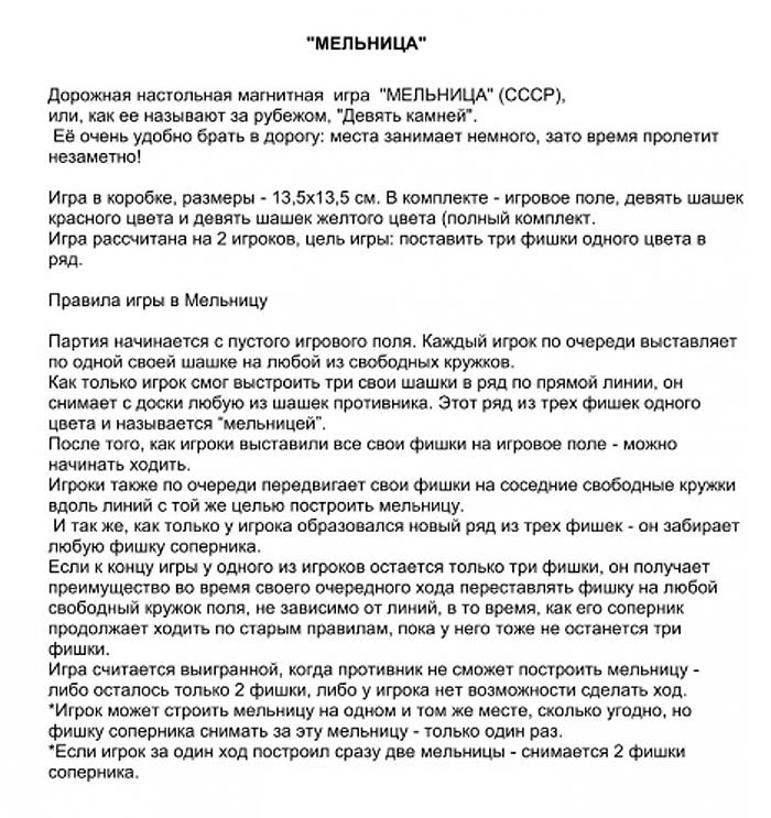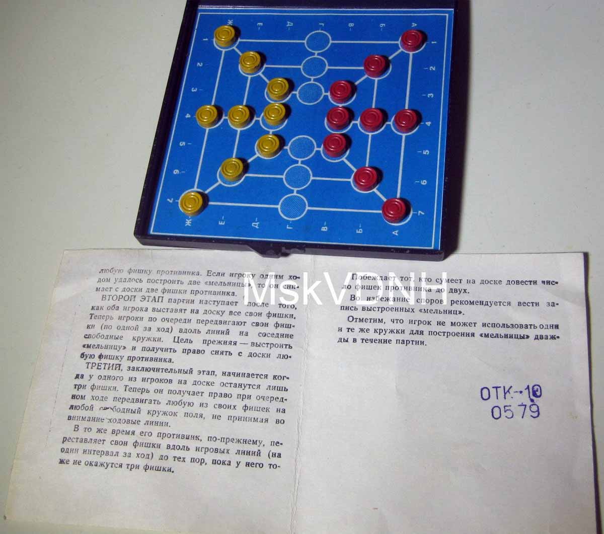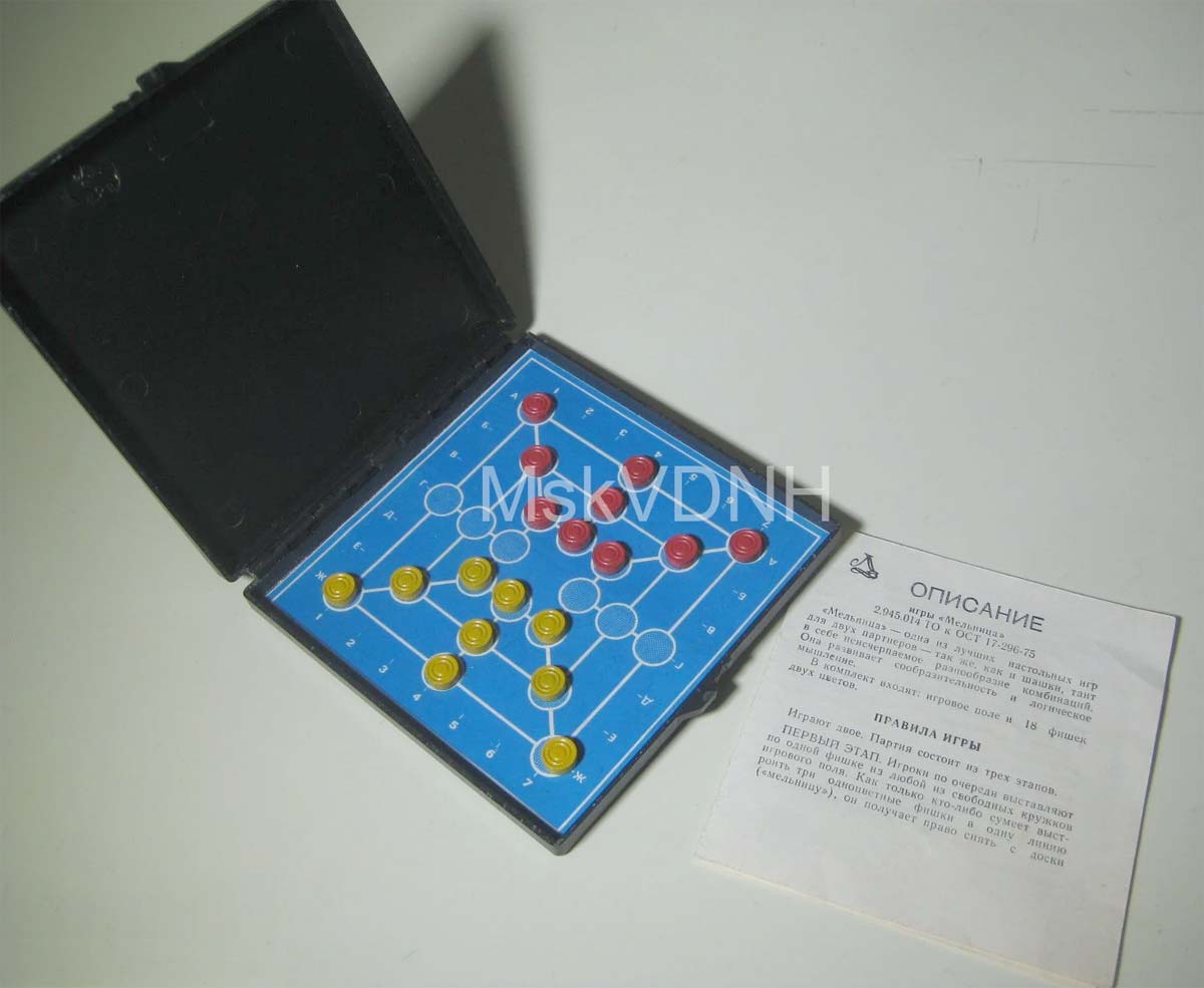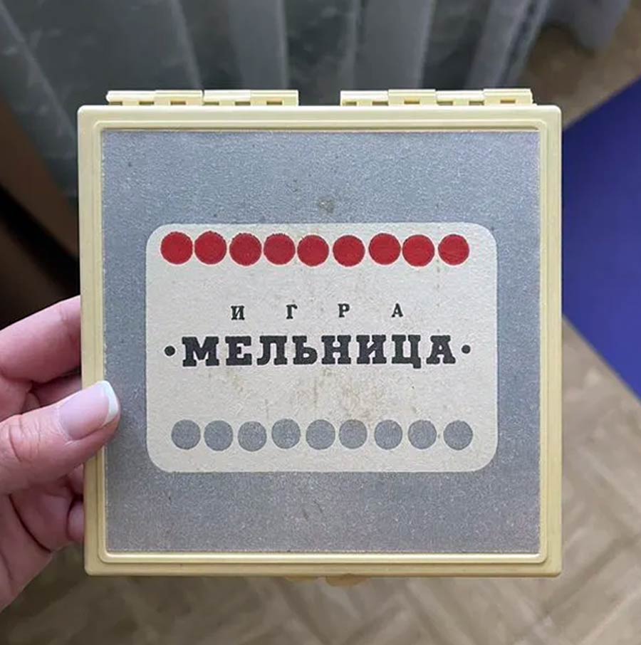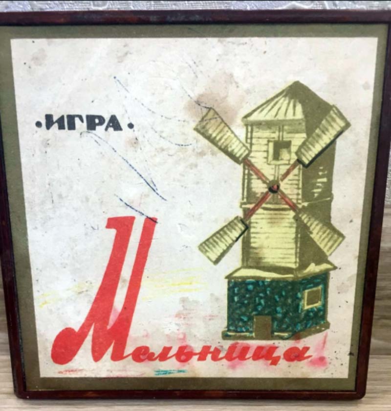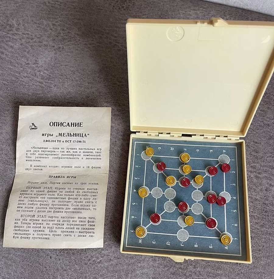 Логическая настольная игра "Мельница" возможно с 1976 года выпускалась Ленинградским заводом "Магнетон". Цель игры в том, чтобы одному из игроков первым поставить три фишки одного цвета в один ряд.