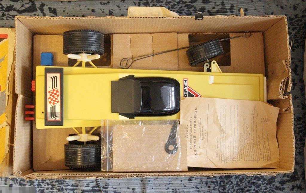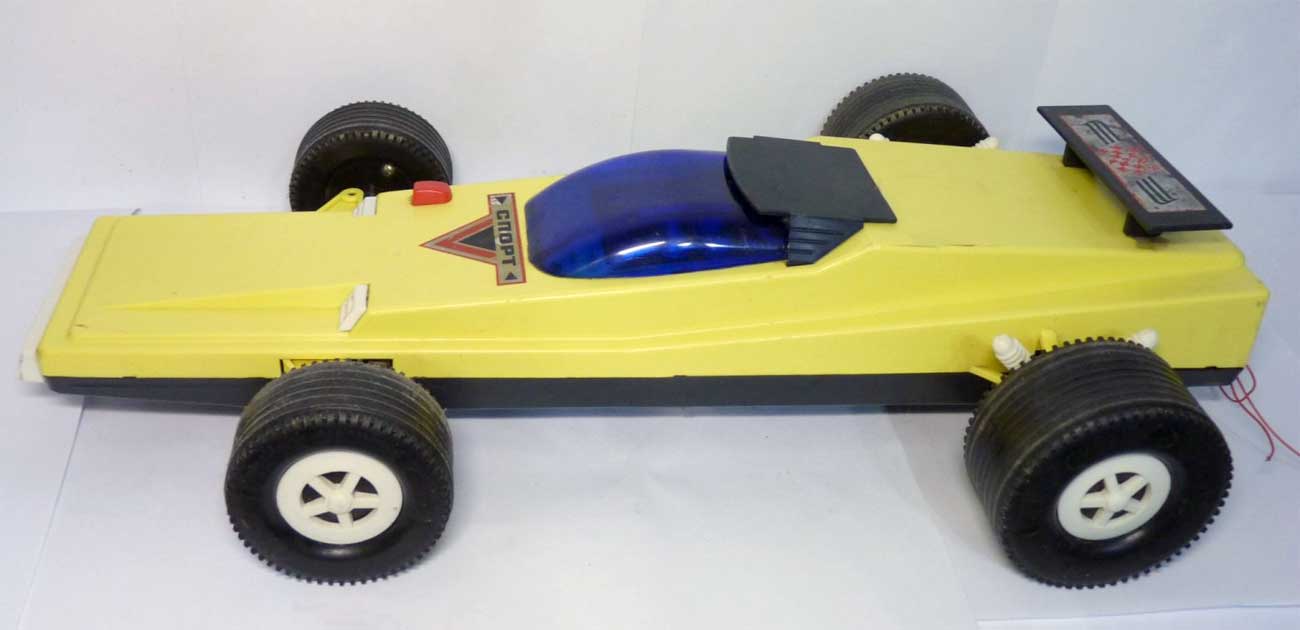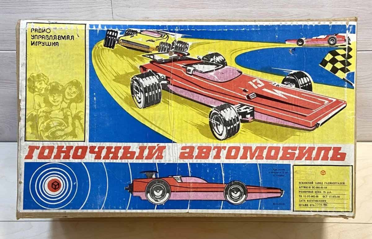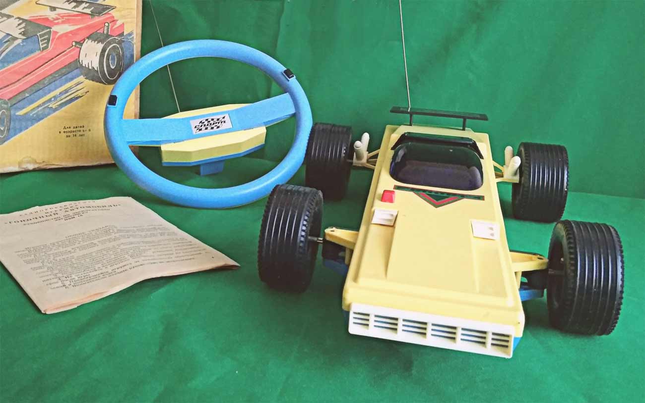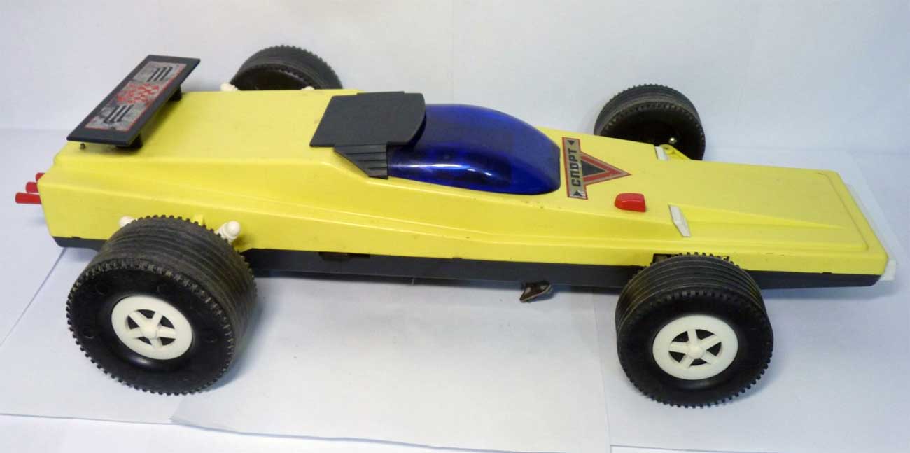 Радиоуправляемая игрушка "Гоночный автомобиль" Спорт выпускалась с 1991 года Псковским заводом радиодеталей в СССР. Внешне похожа на болид Формулы-1. Габариты 50х27х10 см.