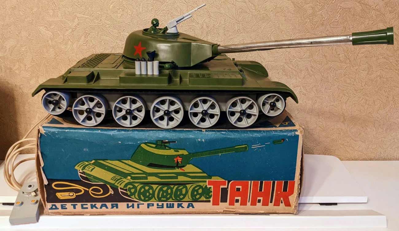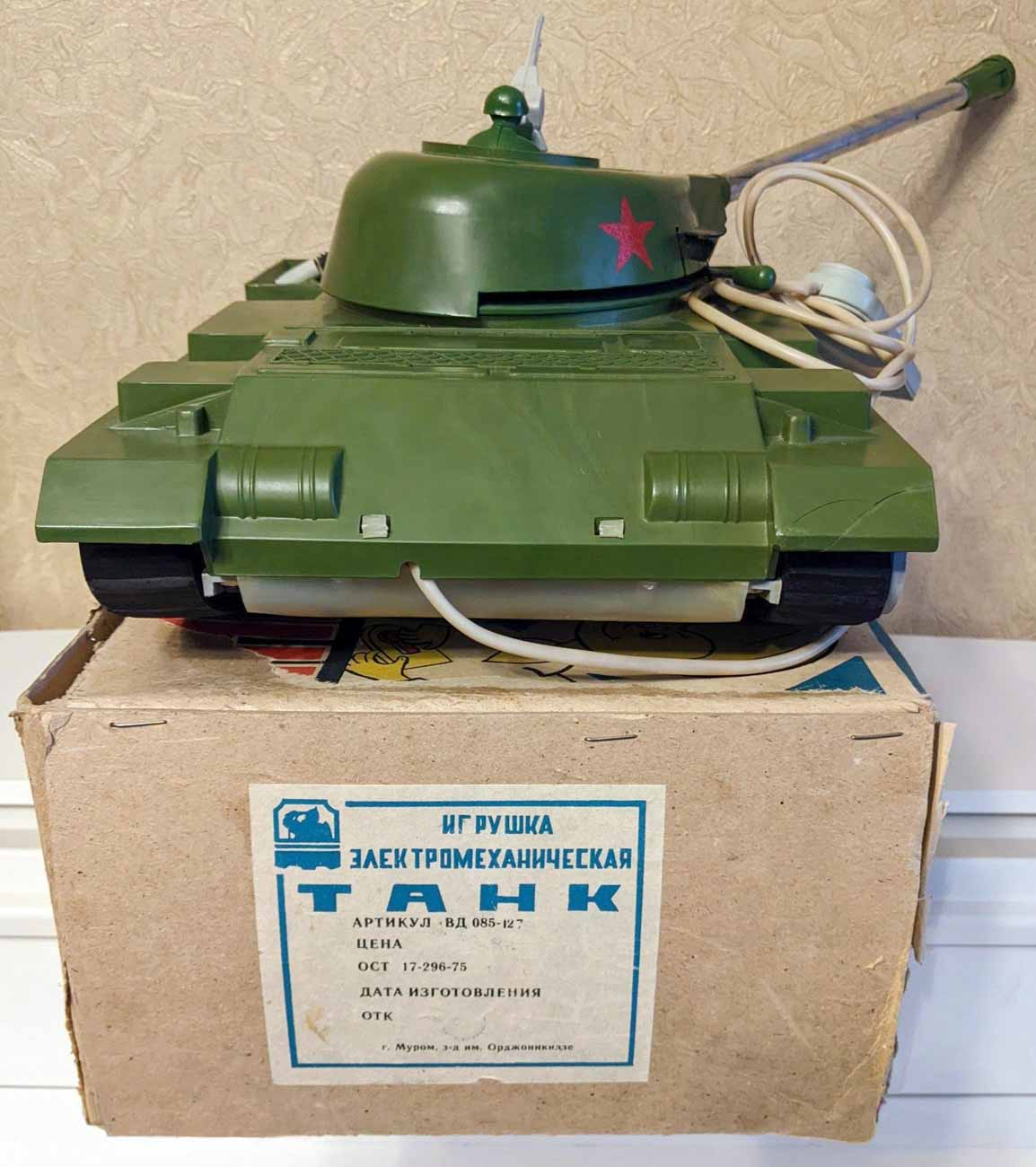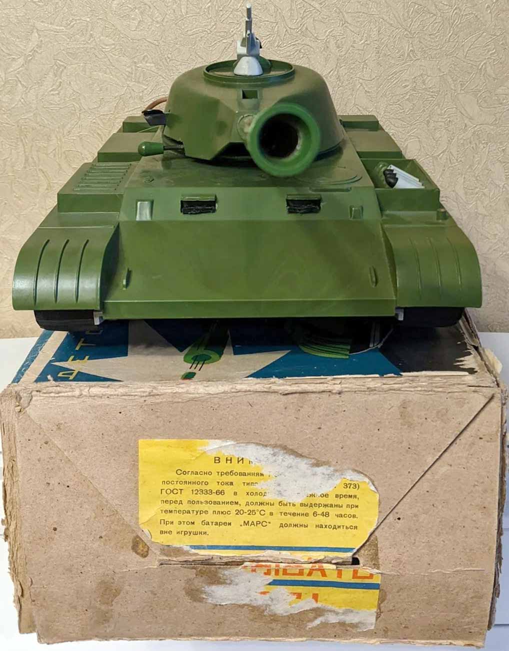 Детская электромеханическая игрушка "Танк" выпускалась возможно с 1977 года Муромским заводом имени Орджоникидзе. Движение вперёд, назад, вправо, влево. 4 элемента 373.