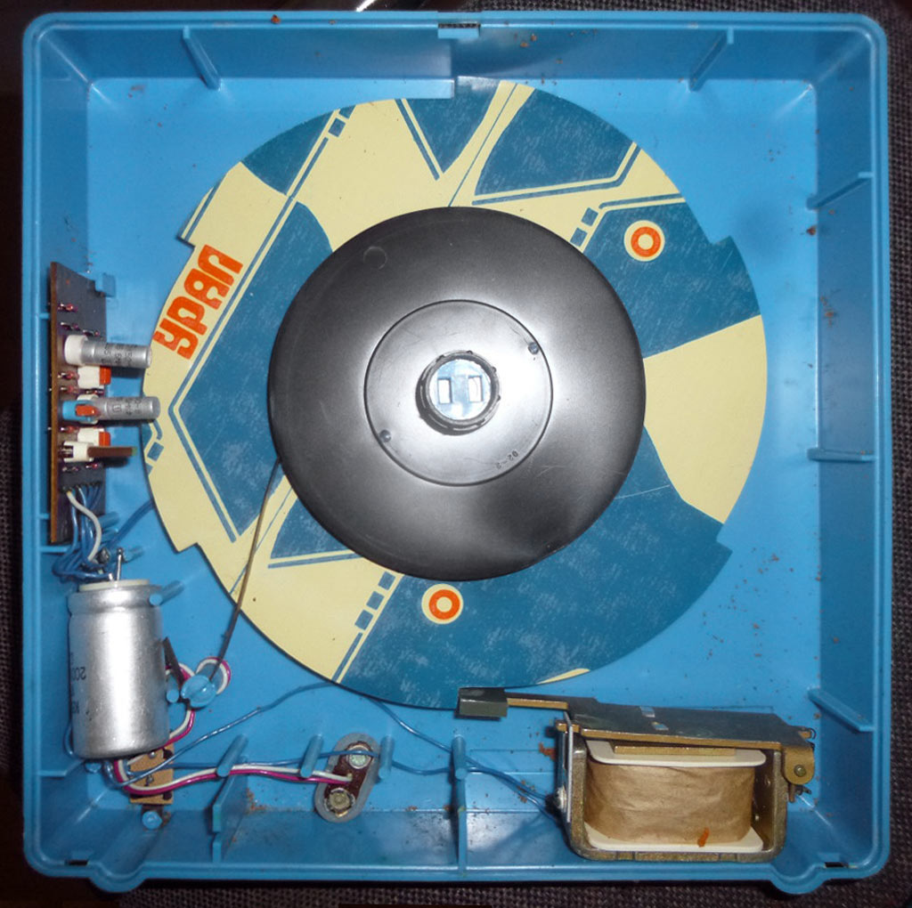 от батареи "Крона". Заводится мишень (Шесть картинок), путём вращения пружины