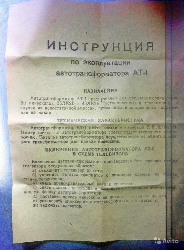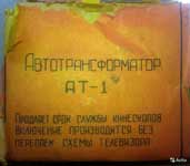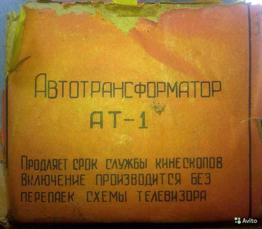 Автотрансформатор "АТ-1" выпускался с 1967 года. Предназначен для продления срока службы кинескопов 35ЛК2Б и 43ЛК2Б в случае потери их частичной эмиссии.