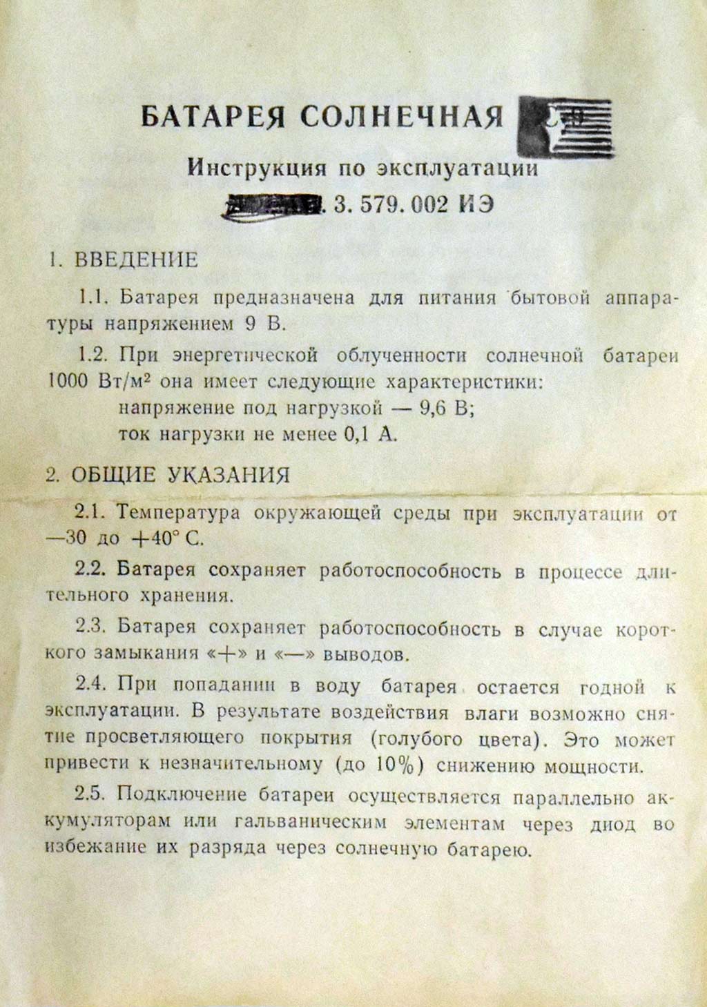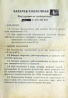 Батарея солнечная выпускалась с 1990 года. Изготовитель не установлен. Предназначена для питания бытовой аппаратуры напряжением 9 вольт.