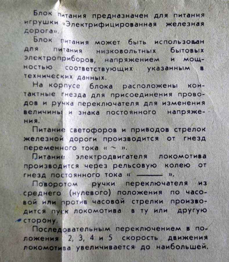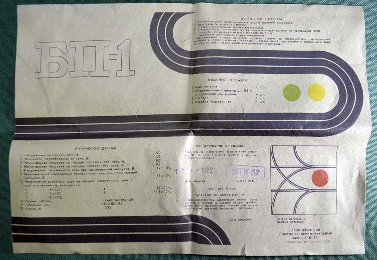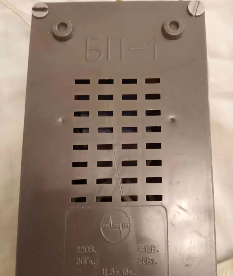 Блок питания "БП-1" выпускался с 1982 года Ленинградским опытно-экспериментальным заводом ВНИИТВЧ. Предназначен для питания игрушки "Электрофицированная железная дорога".