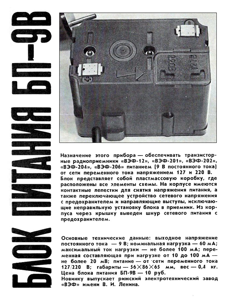 для питания приёмников ВЭФ-12, 201, 202, 204, 206 напряжением 9 В от сети