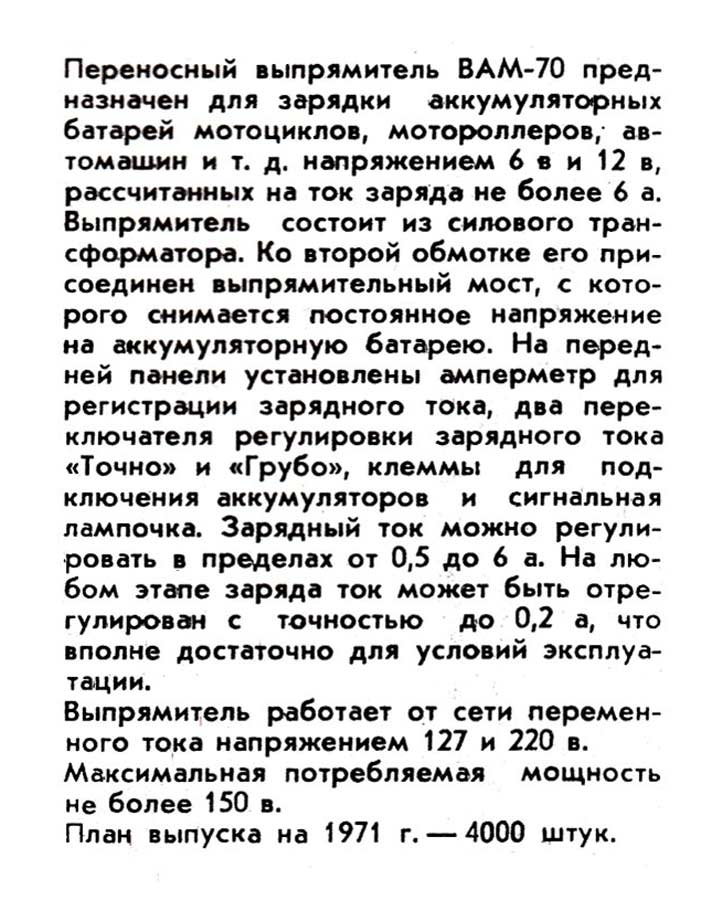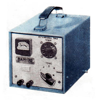 Переносной выпрямитель "ВАМ-70" выпускался с 1971 года. Предназначен для зарядки автомобильных и мотоциклетных аккумуляторов напряжением 6 и 12 В.