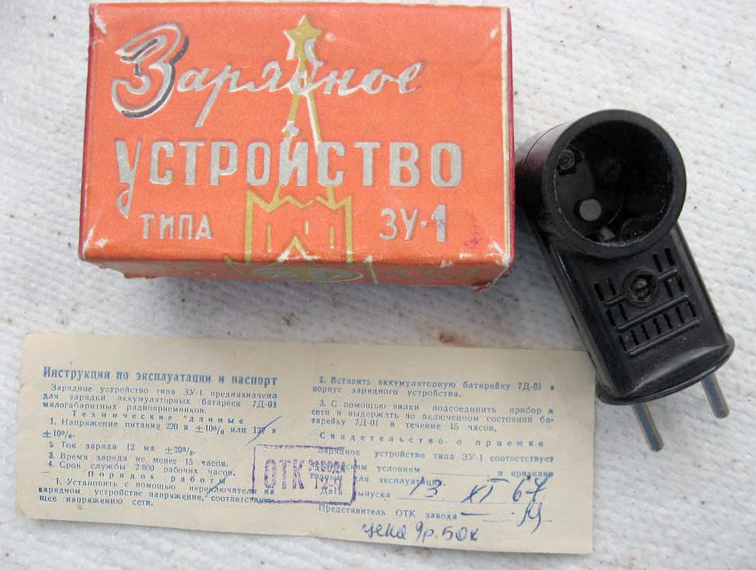 Зарядное устройство "ЗУ-1" выпускалось предположительно с 1964 года. Предназначено для зарядки аккумуляторных батарей типа 7Д-0,1 - служащих для питания транзисторных карманных радиоприёмников.