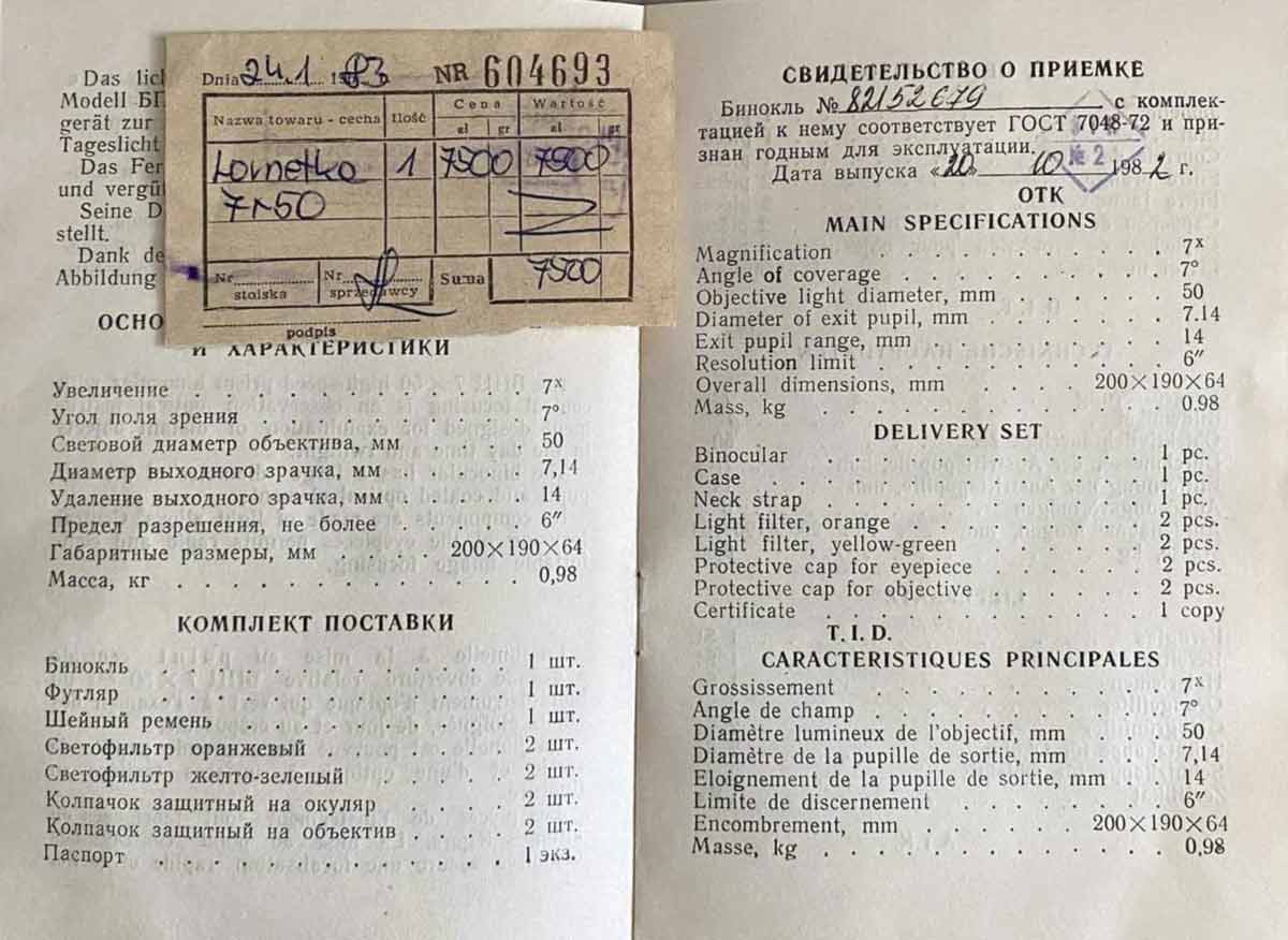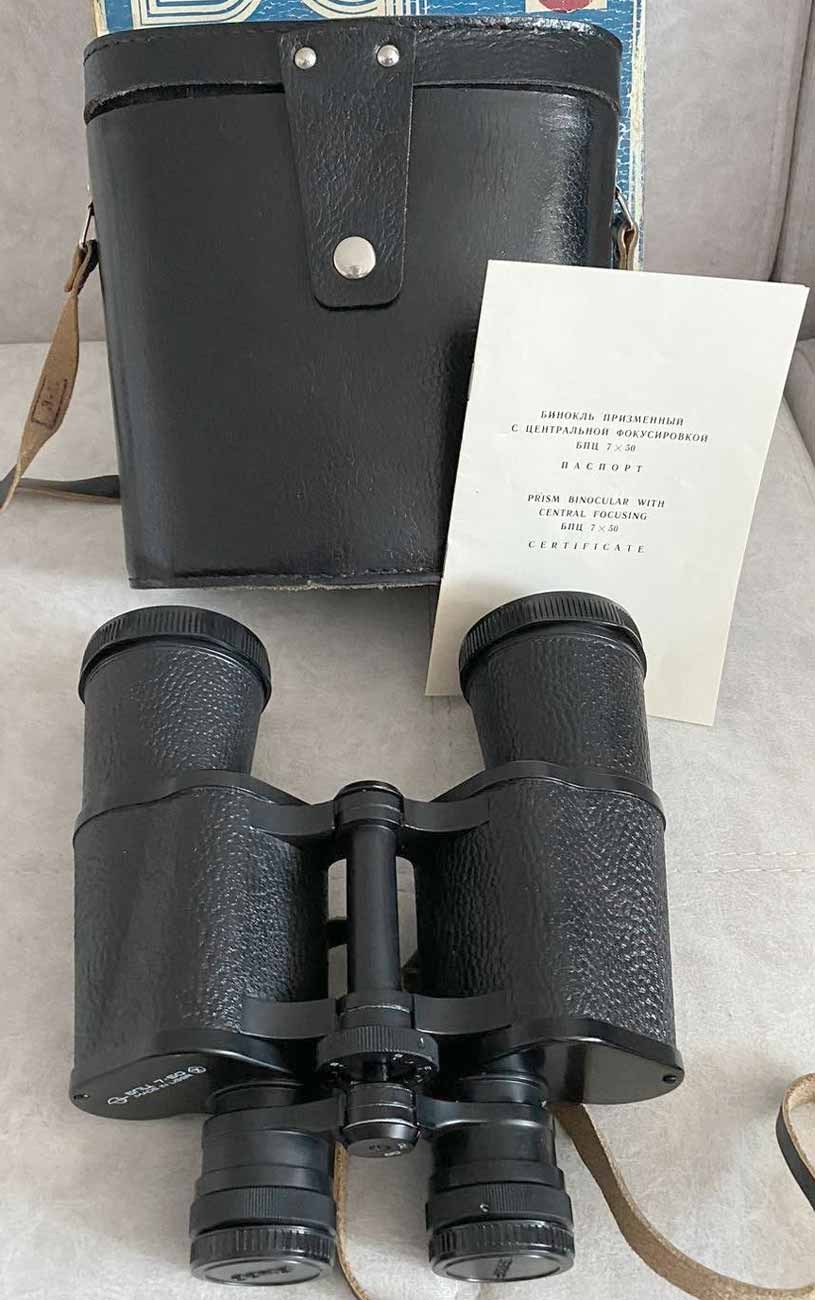 Светосильный бинокль "БПЦ 7Х50" выпускался предположительно с 1977 года. Бинокль служит для наблюдения удалённых объектов и предметов. Имеет увеличение 7Х.