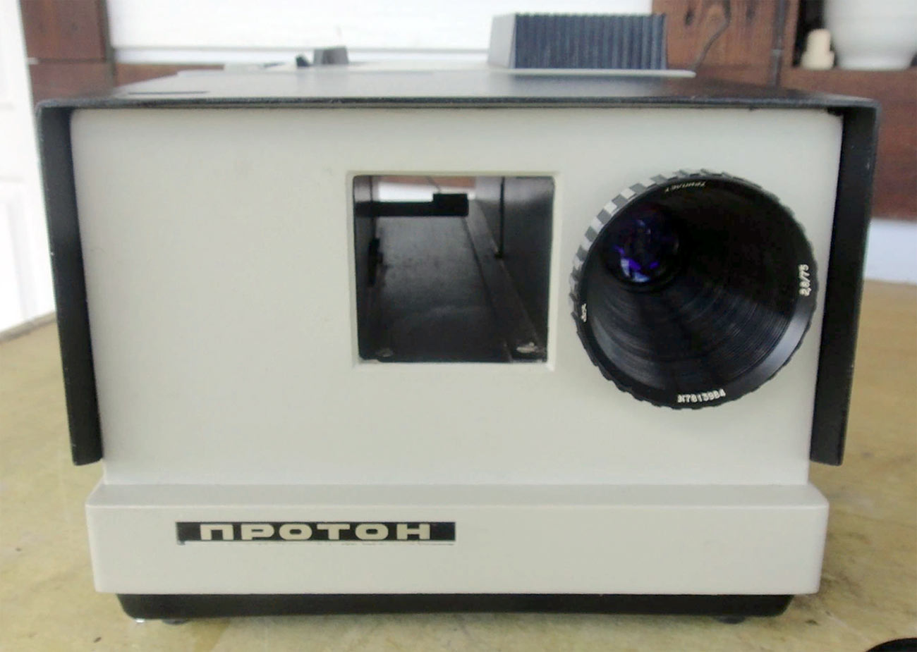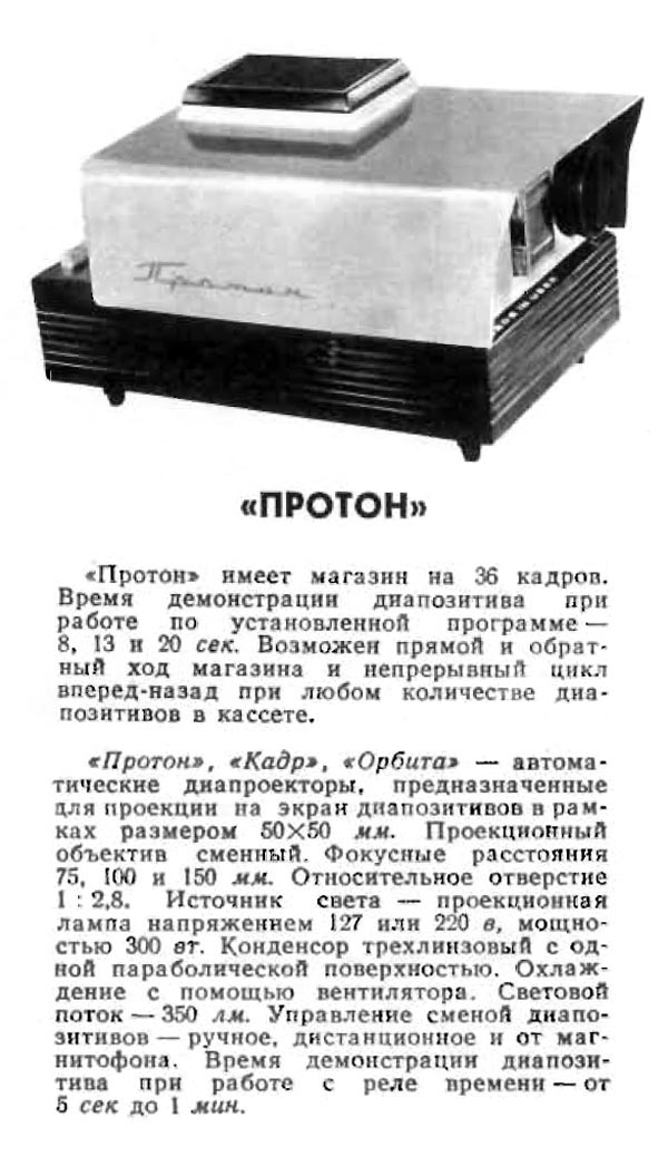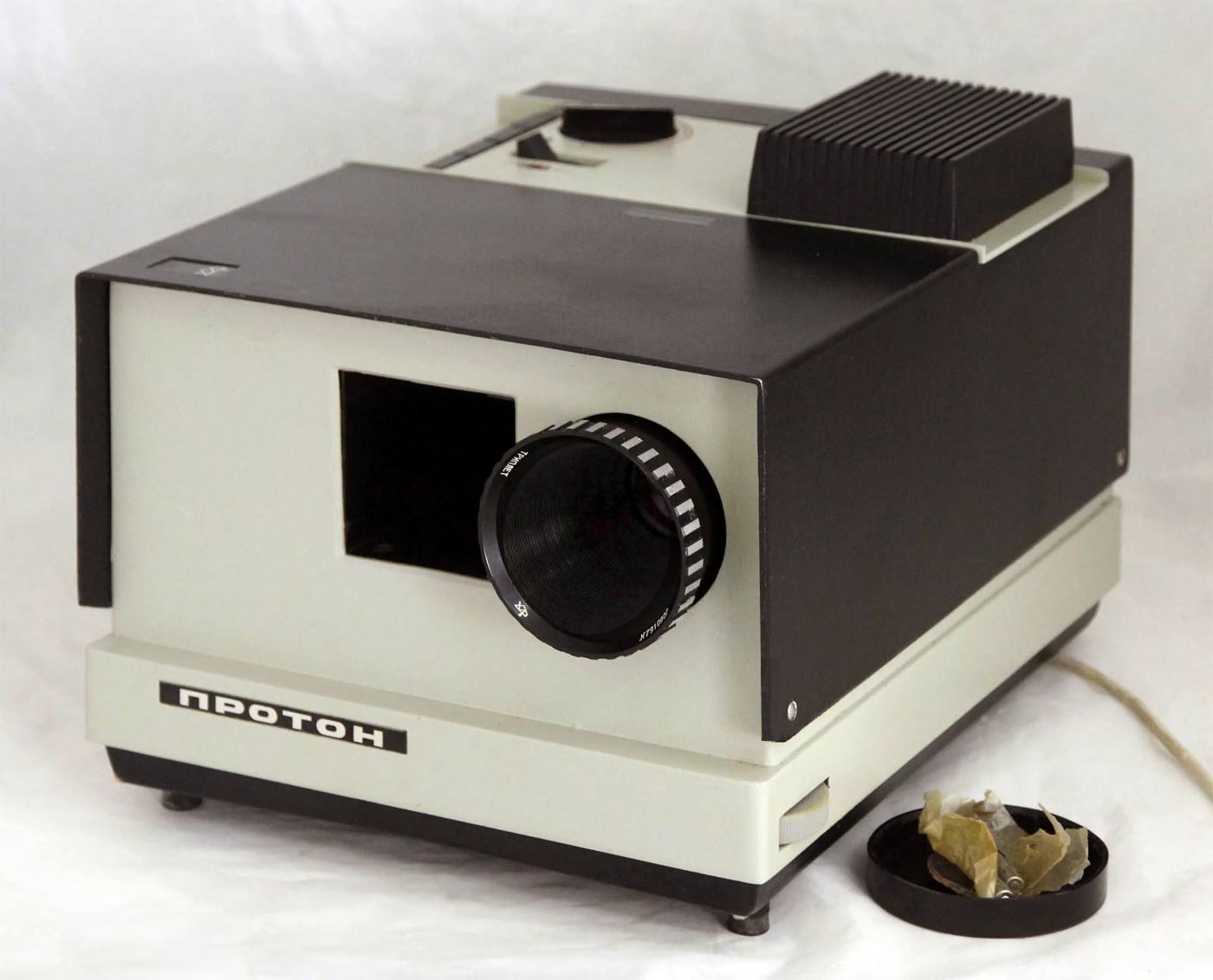 Автоматический диапроектор "Протон" выпускался с 1967 года Казанским оптико-механическим заводом. Описание АДП в рекламе и в интернете.