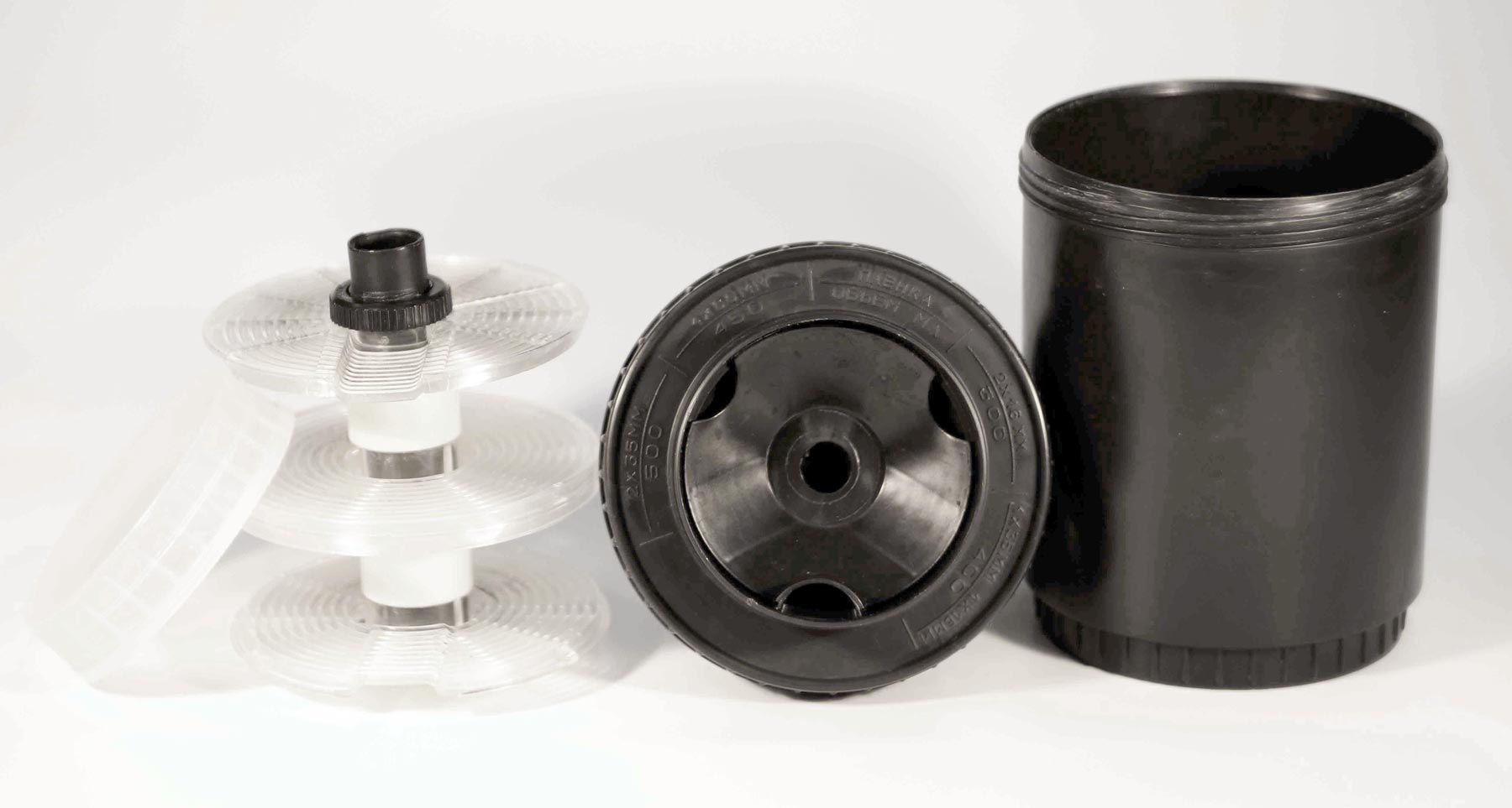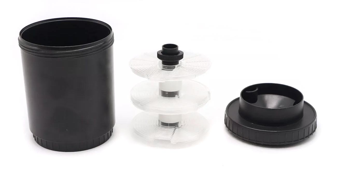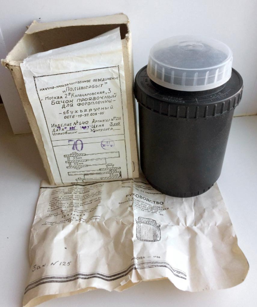 для проявки сразу двух 35 мм фотоплёнок или одной 120-го типа. Бачок выполнен