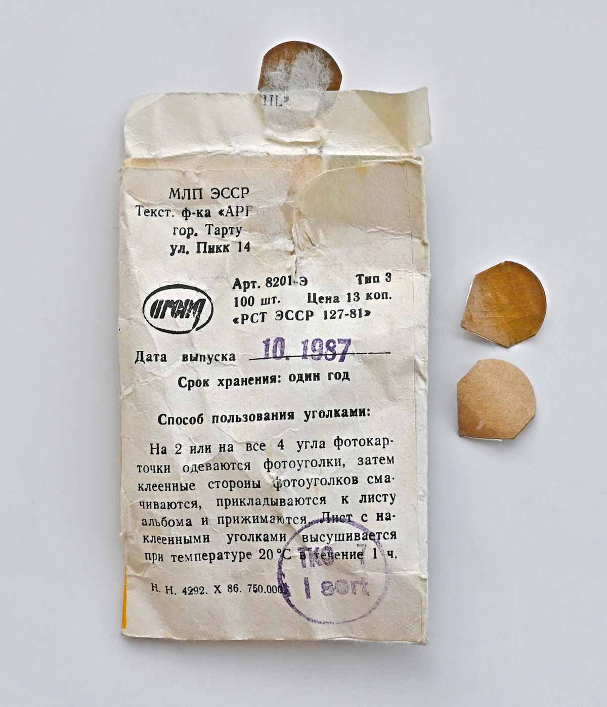 Фотоуголки с целлофаном производились с 1986 года фабрикой "APF", город Тарту. Фотоуголки предназначены для удержания фотографий на страницах фотоальбомов.