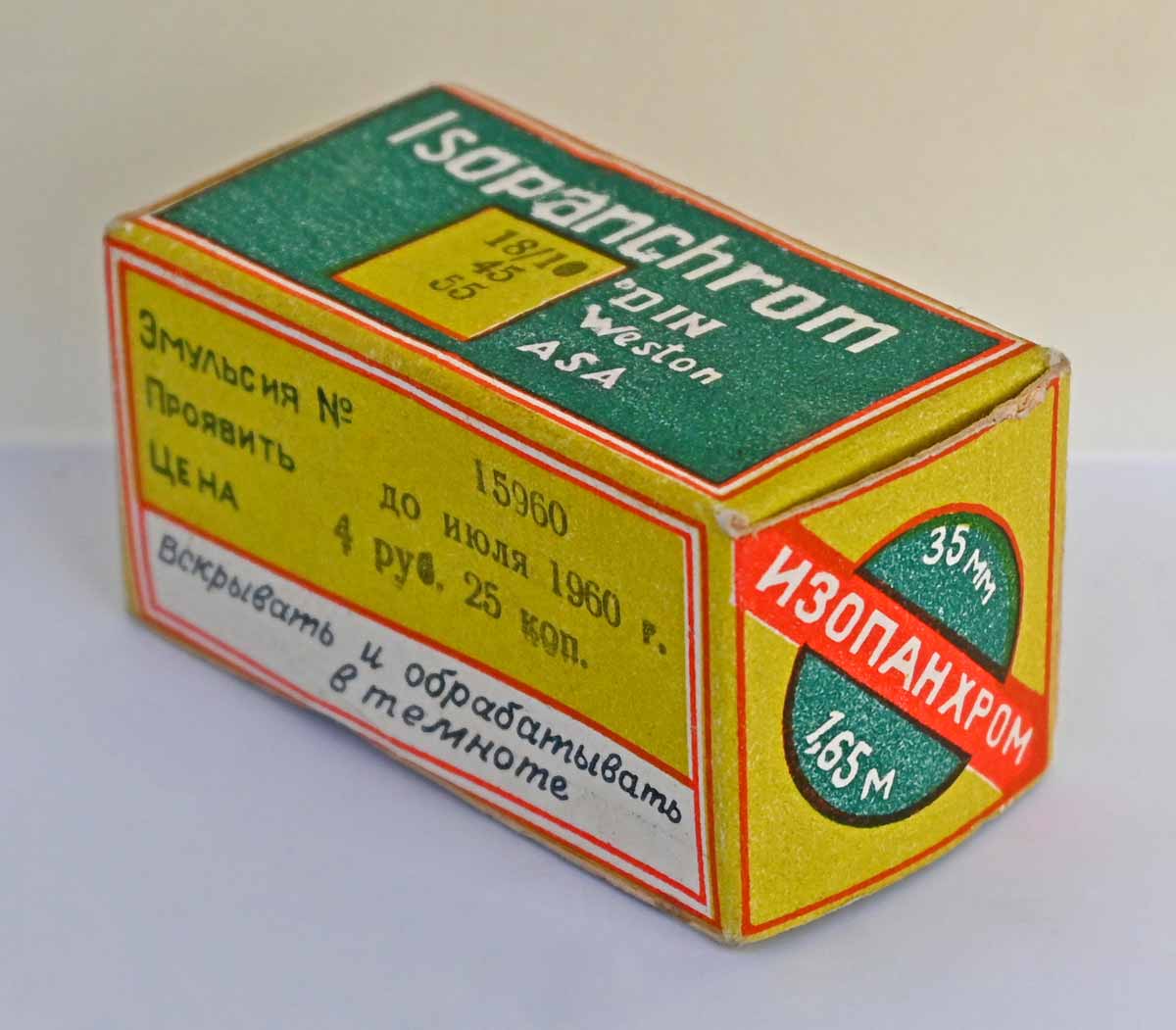 катушке и без, шириной 35 и 60 мм, длиной 1,65 и 0,815 метра. Светочувствительность