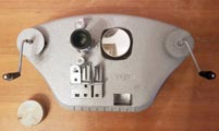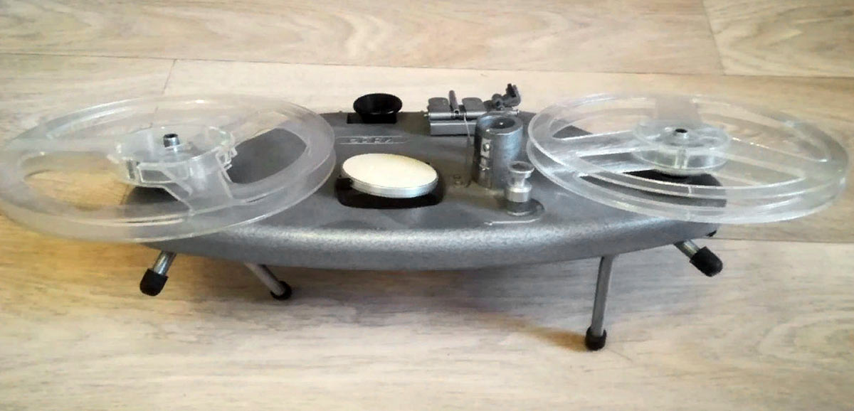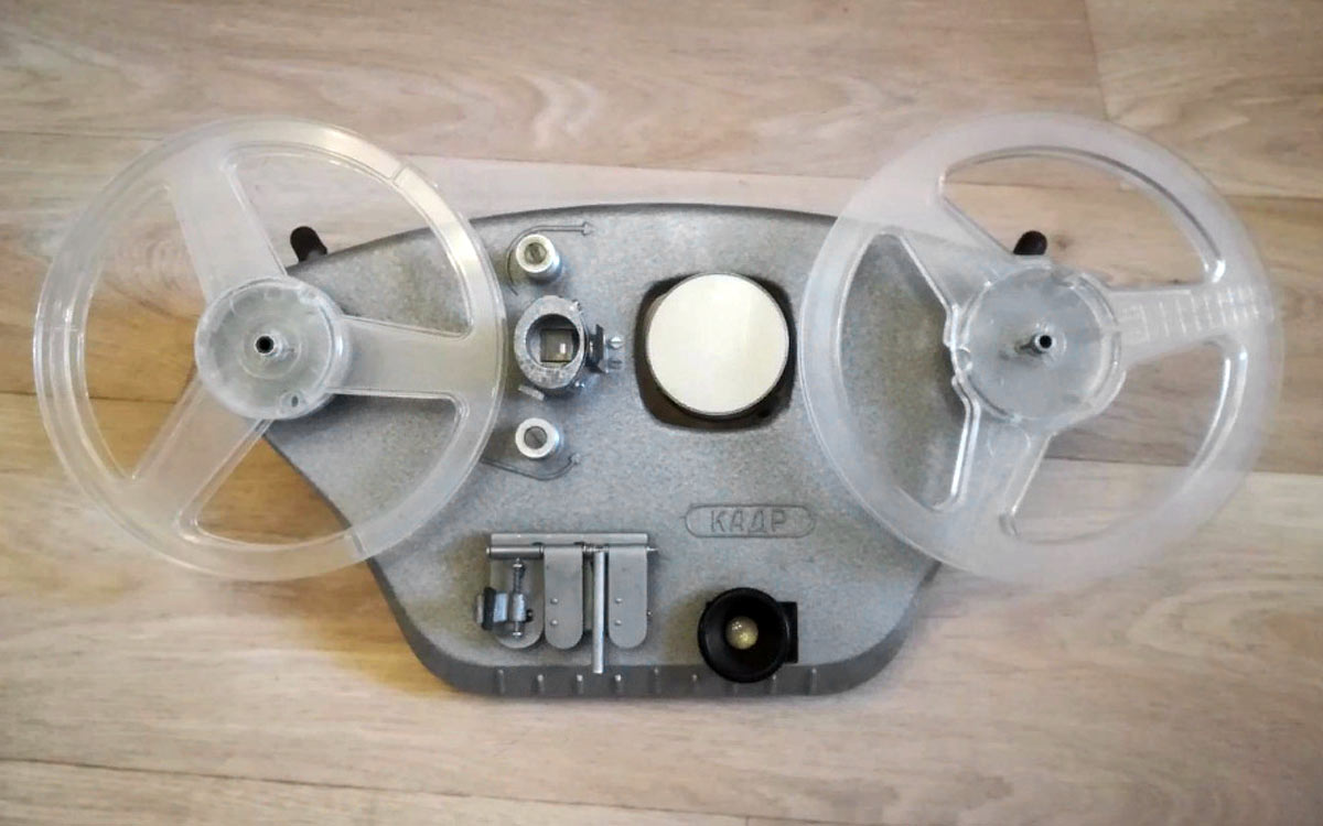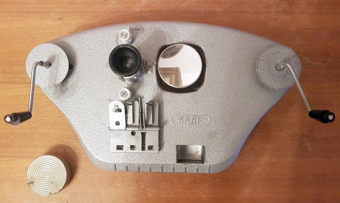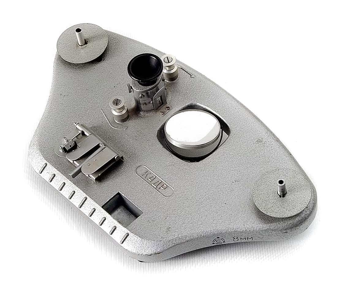 8 мм любительских кинофильмов. Он имеет склеечный прессик, лупу для просмотра