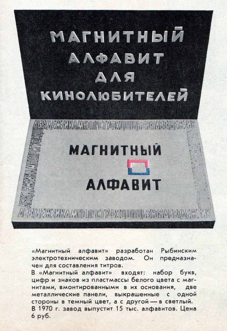 алфавит для кинолюбителей "Магнитный алфавит" выпускался с 1970 года Рыбинским