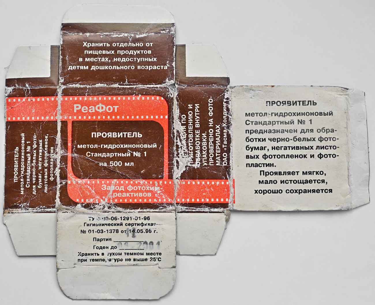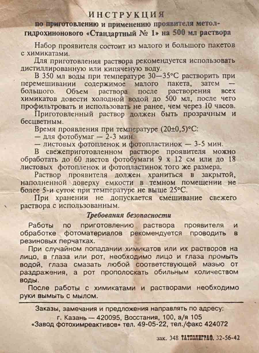 Проявитель метол-гидрохиноновый "Стандартный №1" для ч/б фотобумаг, листовых фотоплёнок и фотопластинок выпускал с 1996 года Казанский завод фотохимреактивов.