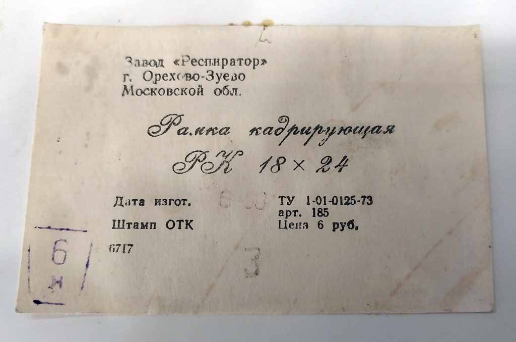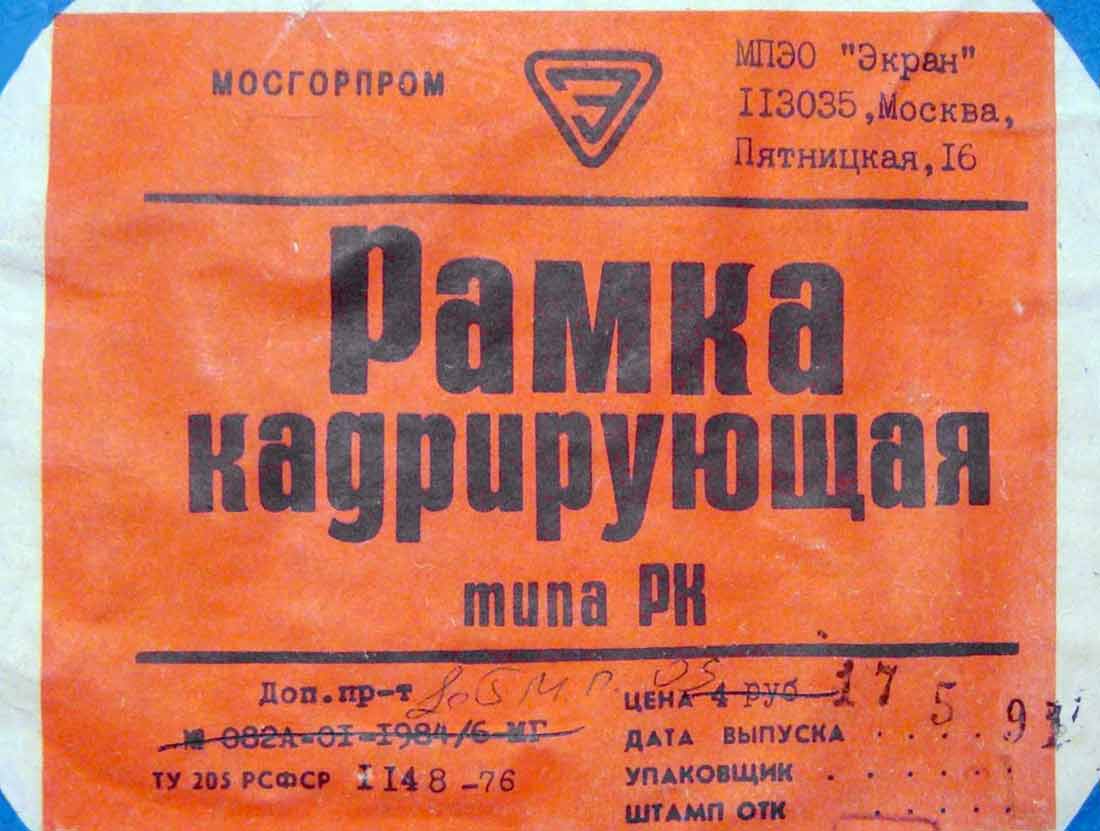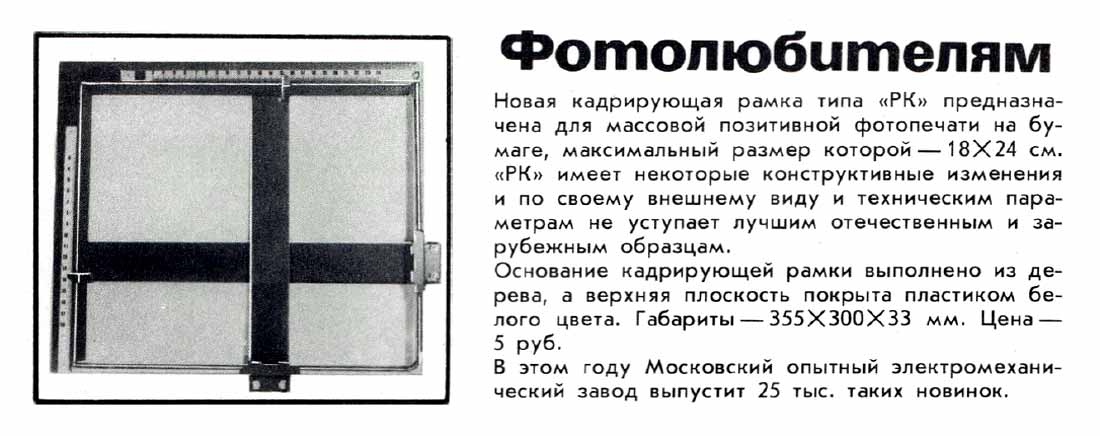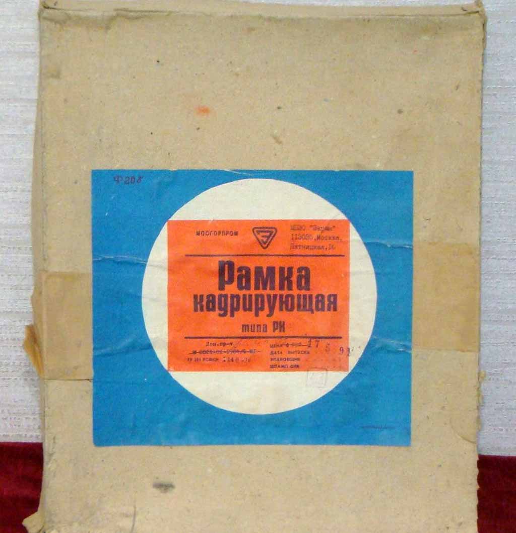 Рамка кадрирующая "РК" производилась с 1973 года несколькими предприятиями страны. РК предназначена для фотопечати фотографий любых размеров до 18 х 24 мм с белой окантовкой по четырём сторонам.