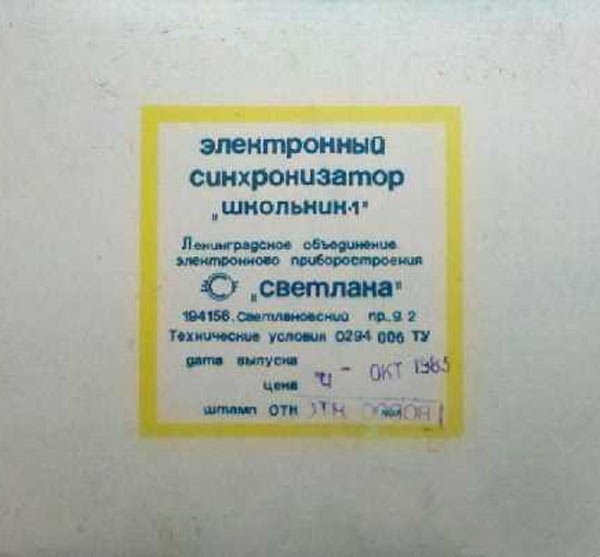Электронный синхронизатор "Школьник-1" выпускался возможно с 1982 года Ленинградским объединением электронного приборостроения "Светлана".
