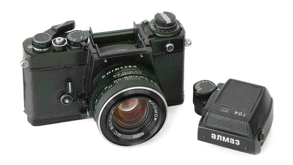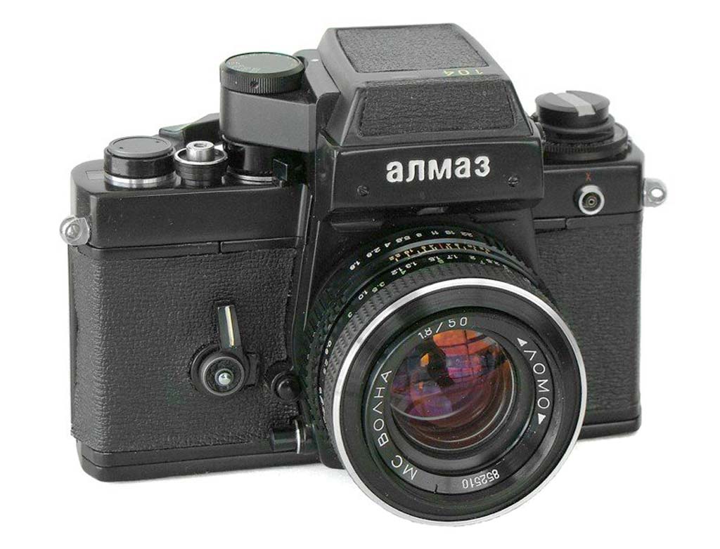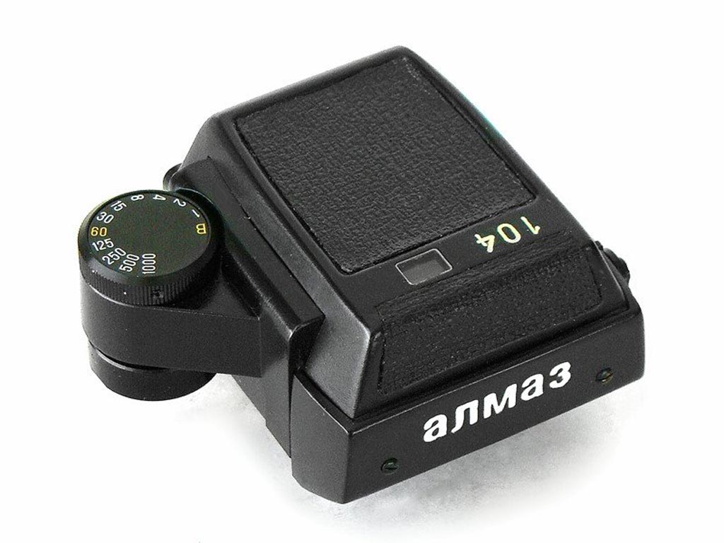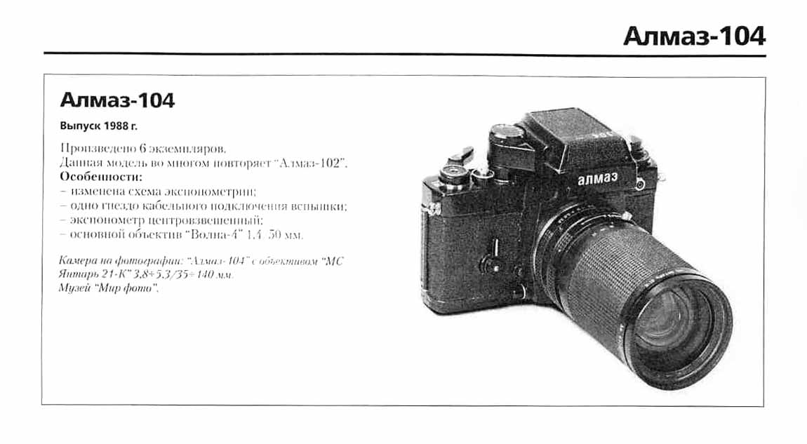 Зеркальный фотоаппарат "Алмаз-104" произведён в 1988 году на ЛОМО. Всего выпушено шесть экземпляров. В основном повторяет модель "Алмаз-102".