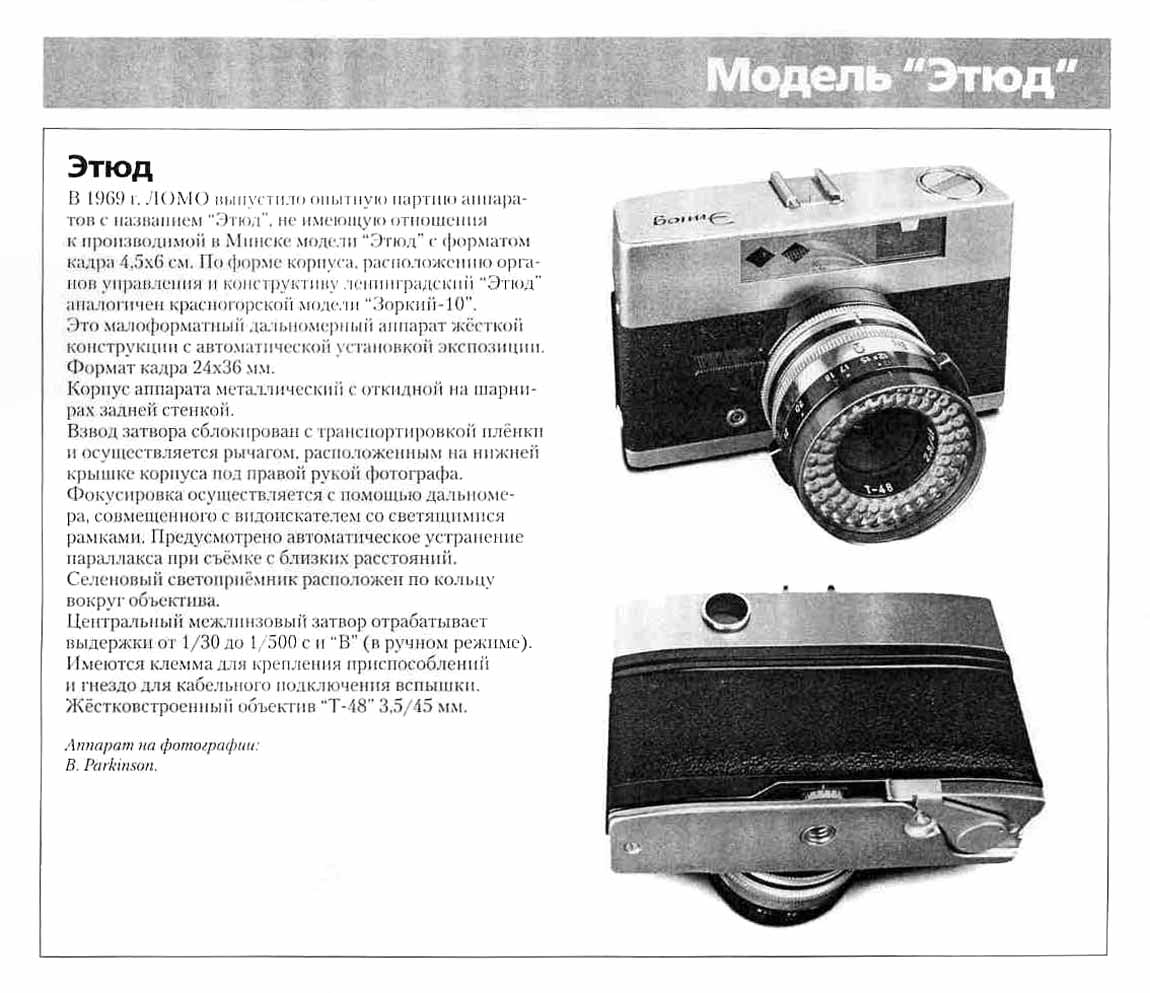 Фотоаппараты "Этюд" и "А-1" произведены опытно в 1969 году Ленинградским ГОМЗ. Информации почти нет, но можно посмотреть сайты http://ussrphoto.com/ и https://ussrcameras.ru/, где и взяты их фотографии.