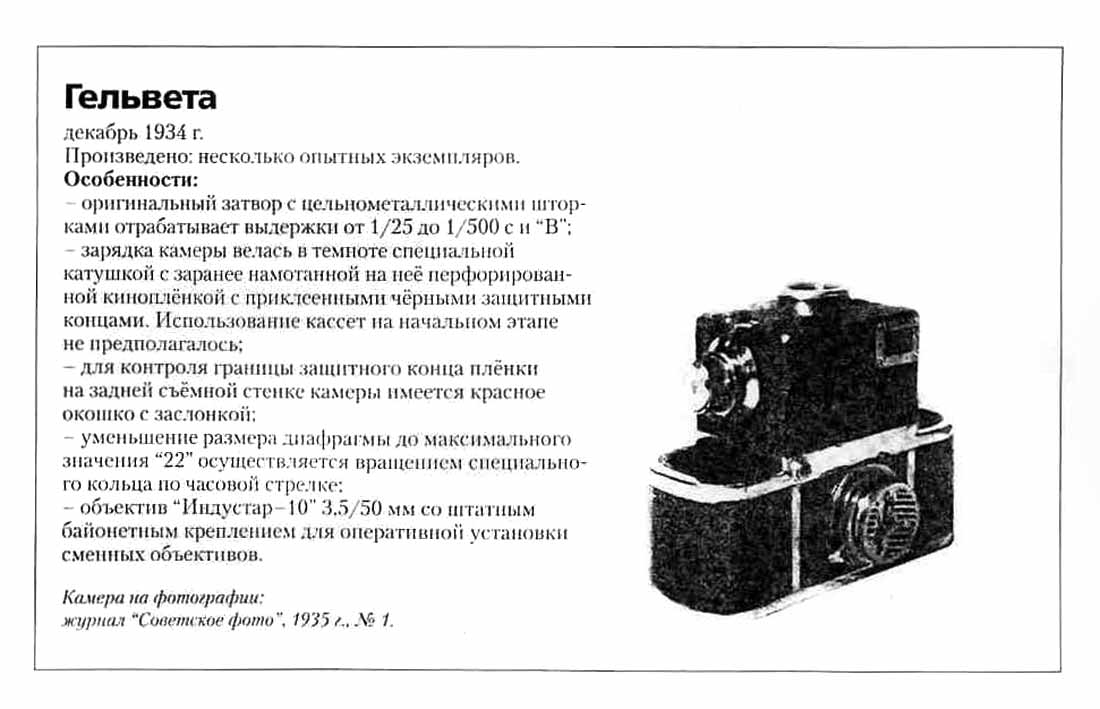 Фотоаппарат "Гельвета" опытно выпущен в 1934 году Ленинградским Государственным оптико-механическим заводом. Стал прототипом будущего фотоаппарата "Спорт".