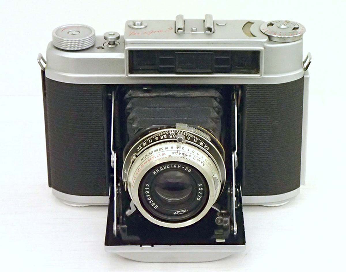 размером 6 х 6 см. Объектив "Индустар-58" - 3,5/75 мм, сопряжён с дальномером.