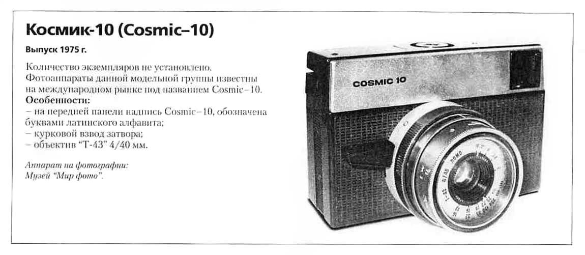 Фотоаппарат "Космик-10" (Cosmic-10) в 1975 году выпустило Ленинградское ОМО. Это экспортный выпуск фотоаппарата под популярный в то время на западе формат плёнки типа "126" в специальных кассетах.