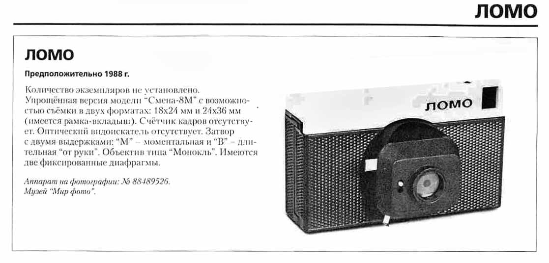Малоформатный фотоаппарат "Ломо" выпускался возможно с 1988 года "ЛОМО". Детский фотоаппарат. Упрощённая версия модели "Смена-8М" с возможностью съёмки в двух форматах: 18х24 мм и 24х36 мм.