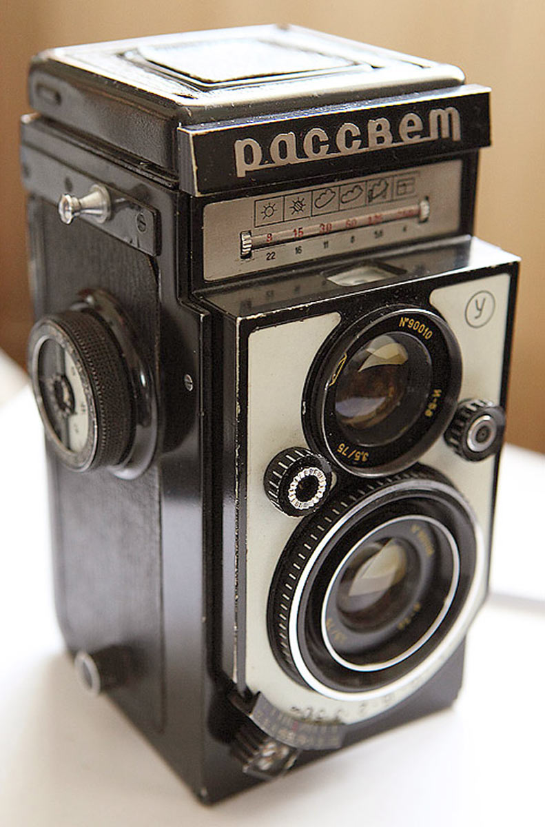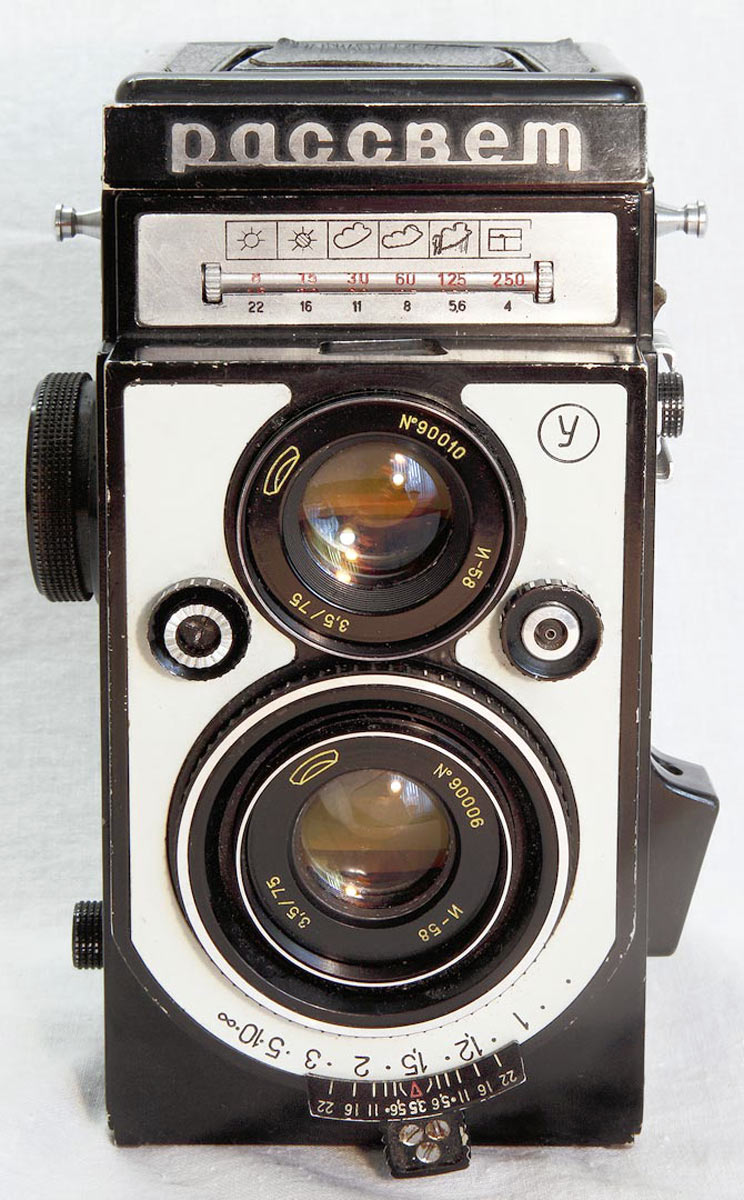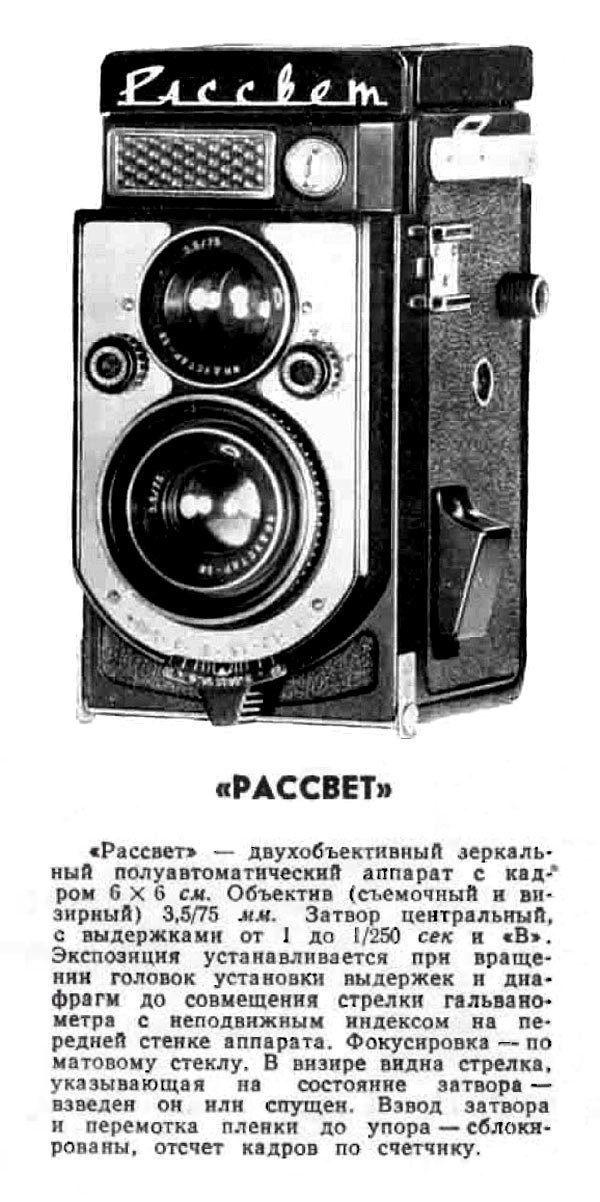 двухобъективный полуавтоматический фотоаппарат "Рассвет" предназначен для