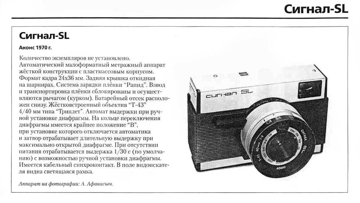 Автоматический малоформатный фотоаппарат "Сигнал-SL" опытно, в незначительном количестве выпущен в 1970 году на "ЛОМО".