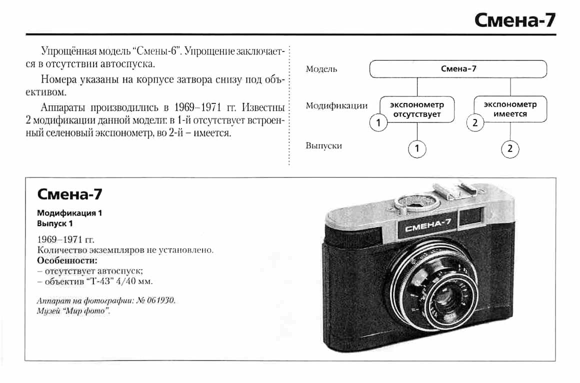 от модели "Смена-6" только отсутствием автоспуска. В модели применён просветлённый