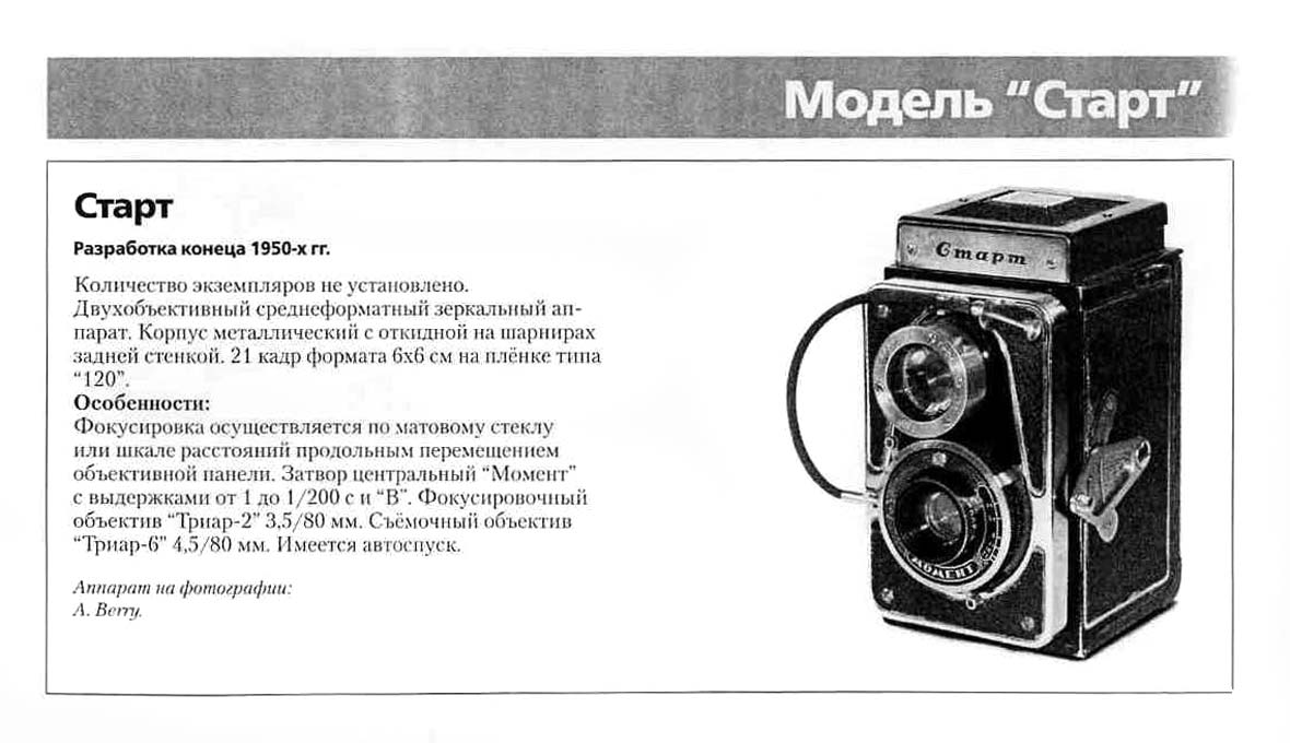 Двухобъективный среднеформатный зеркальный фотоаппарат "Старт" разработан предположительно в 1959 году. Вмещает 21 кадр размером 6 х 6 см на фотоплёнке типа "120".
