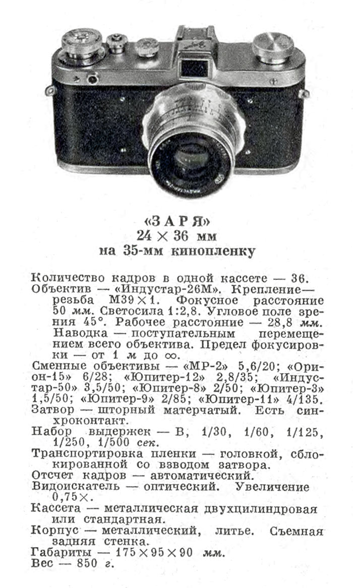 фотовспышки или съёмного дальномера. Фотоаппаратов "Заря" выпущено около