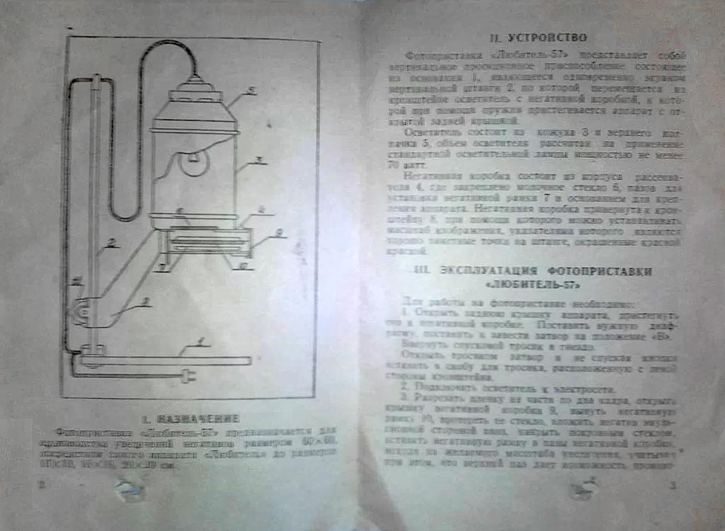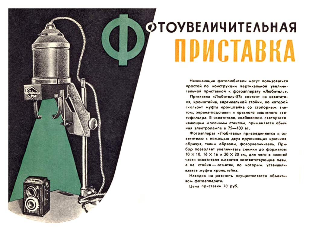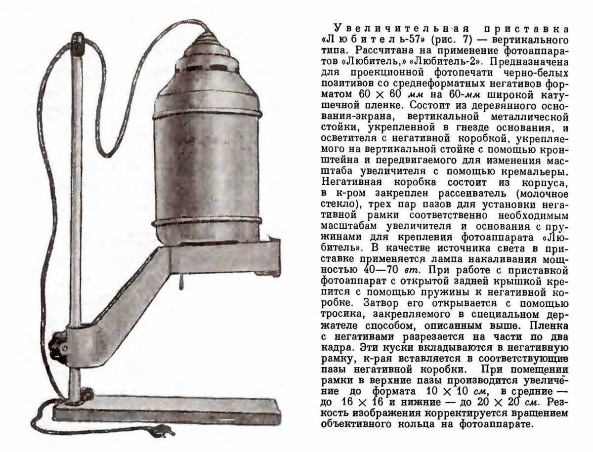 Фотоувеличительная приставка "Любитель-57" производилась предположительно с 1958 года Московским заводом фотопринадлежностей. Предназначена для печати фотографий через фотоаппарат "Любитель".