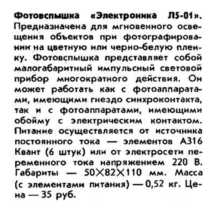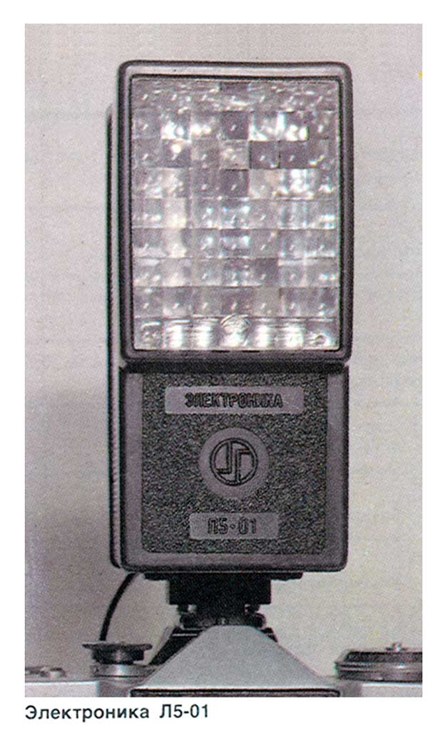 Малогабаритная импульсная фотовспышка "Электроника Л5-01" производилась предположительно с 1980 года Харьковским заводом "Радиодеталь". Предназначена для мгновенного освещения объектов съёмки.