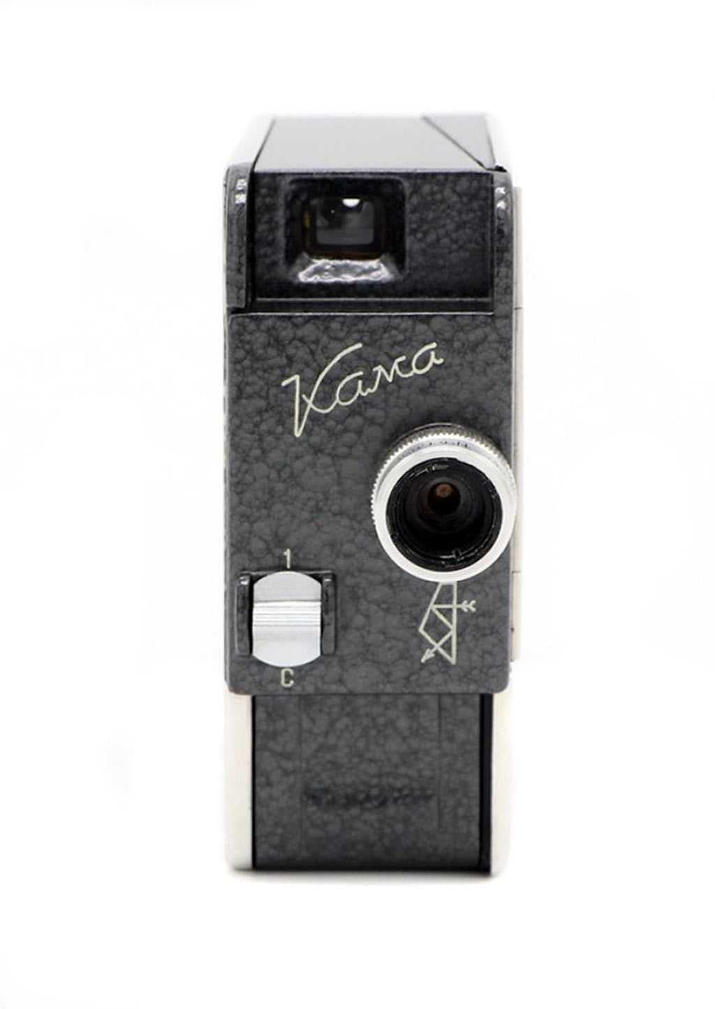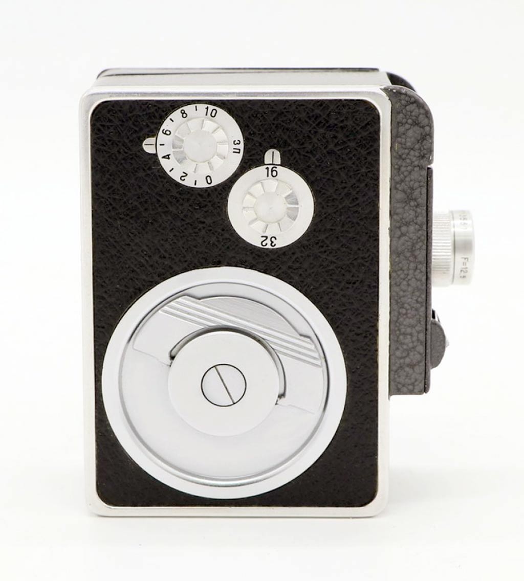 кассета, вмещающая 10 м. киноплёнки 1х8 мм. Объектив триплет-анастигмат