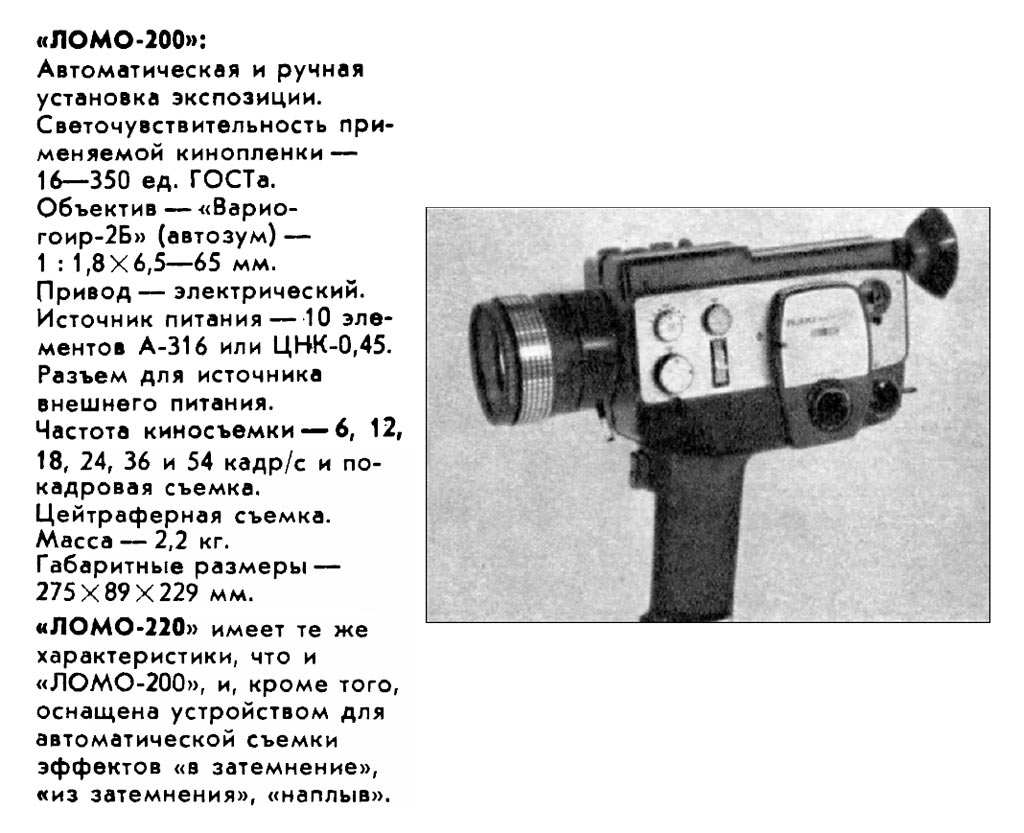 и "Ломо-220" опытно выпускались с 1978 года на ЛОМО. Кинокамера "Ломо-220"