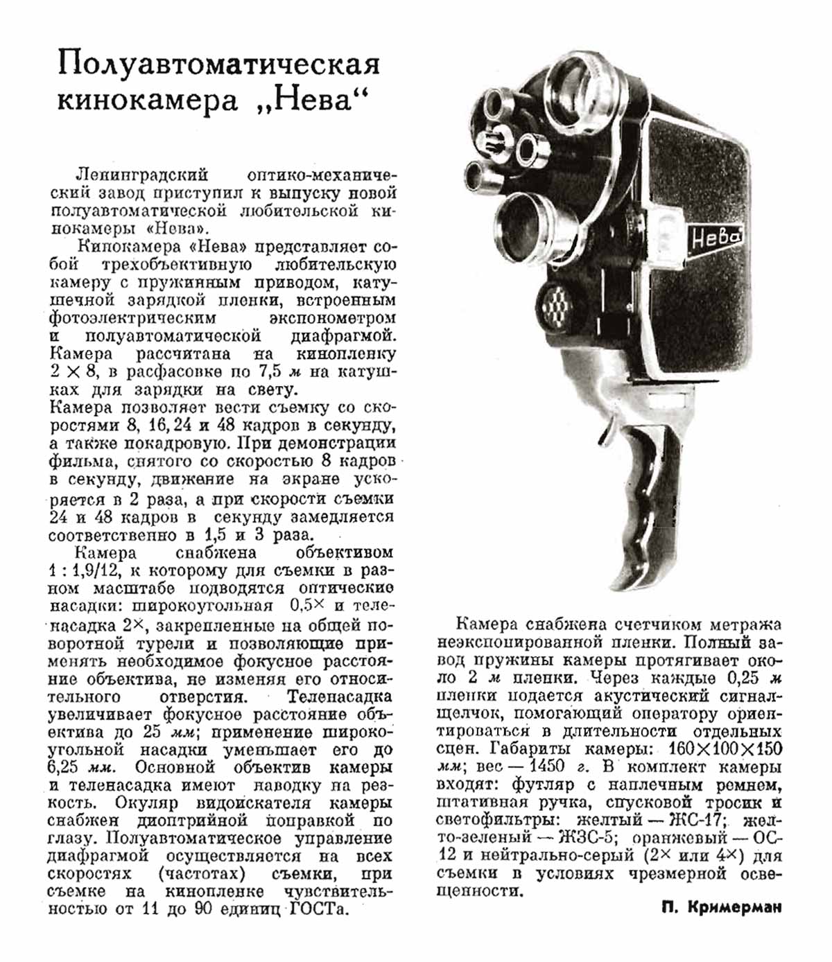 ассчитан на протяжку 2 метров кинопленки. Камера имеет экспонометрическое