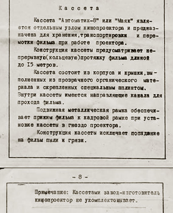 киноплёнке в специальных кассетах "Маяк" или "Автоматик-8". Кинопроектор