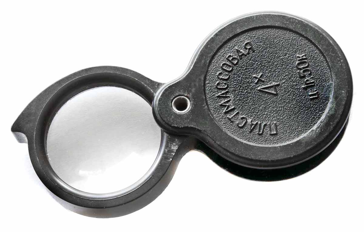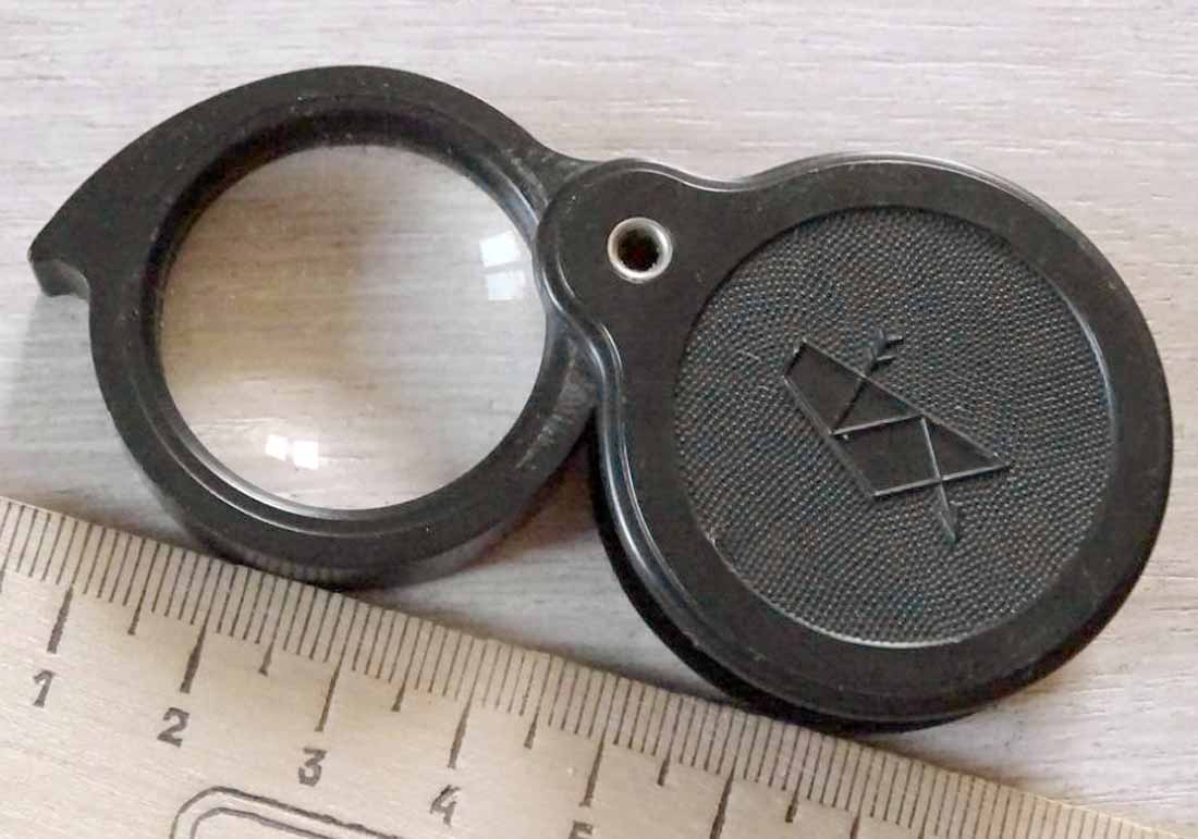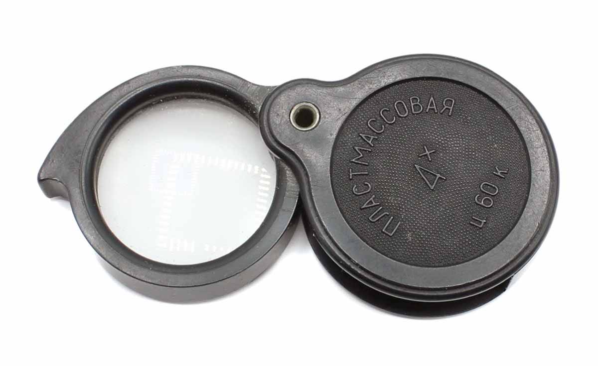 Лупа 4х (четырёхкратная) складная, пластмассовая выпускалась возможно с 1969 года Казанским оптико-механическим заводом №237. Рабочий диаметр линзы 18 мм. Габариты 30 х 40 х 10 мм. Цена различная.