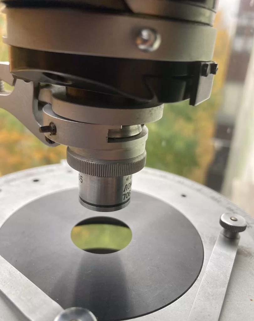 Цена деления шкал поляризатора и анализатора: 5 градусов. Предметный столик: