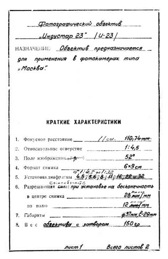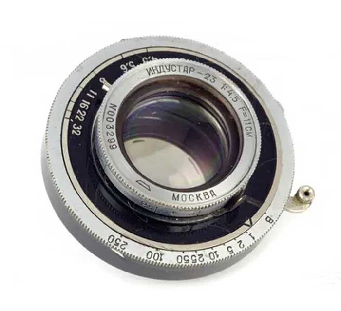 Фотографический объектив "Индустар-23" производился предположительно с 1946 года на Казанском ОМЗ. Объектив предназначен для работы с фотографическими камерами моделей "Москва" или "Момент".