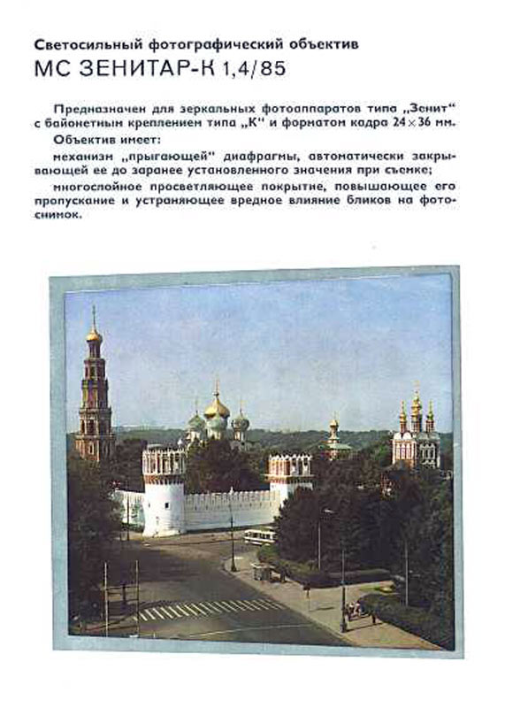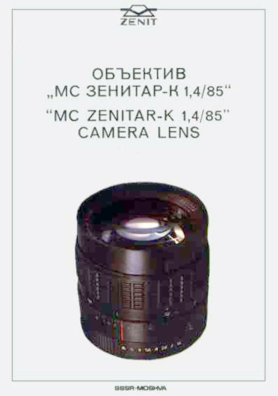 Объектив "МС Зенитар-К 1,4/85" выпускался возможно с 1989 года Красногорским механическим заводом. Светосильный объектив среднего фокусного расстояния для фотоаппаратов с байонетным соединением.