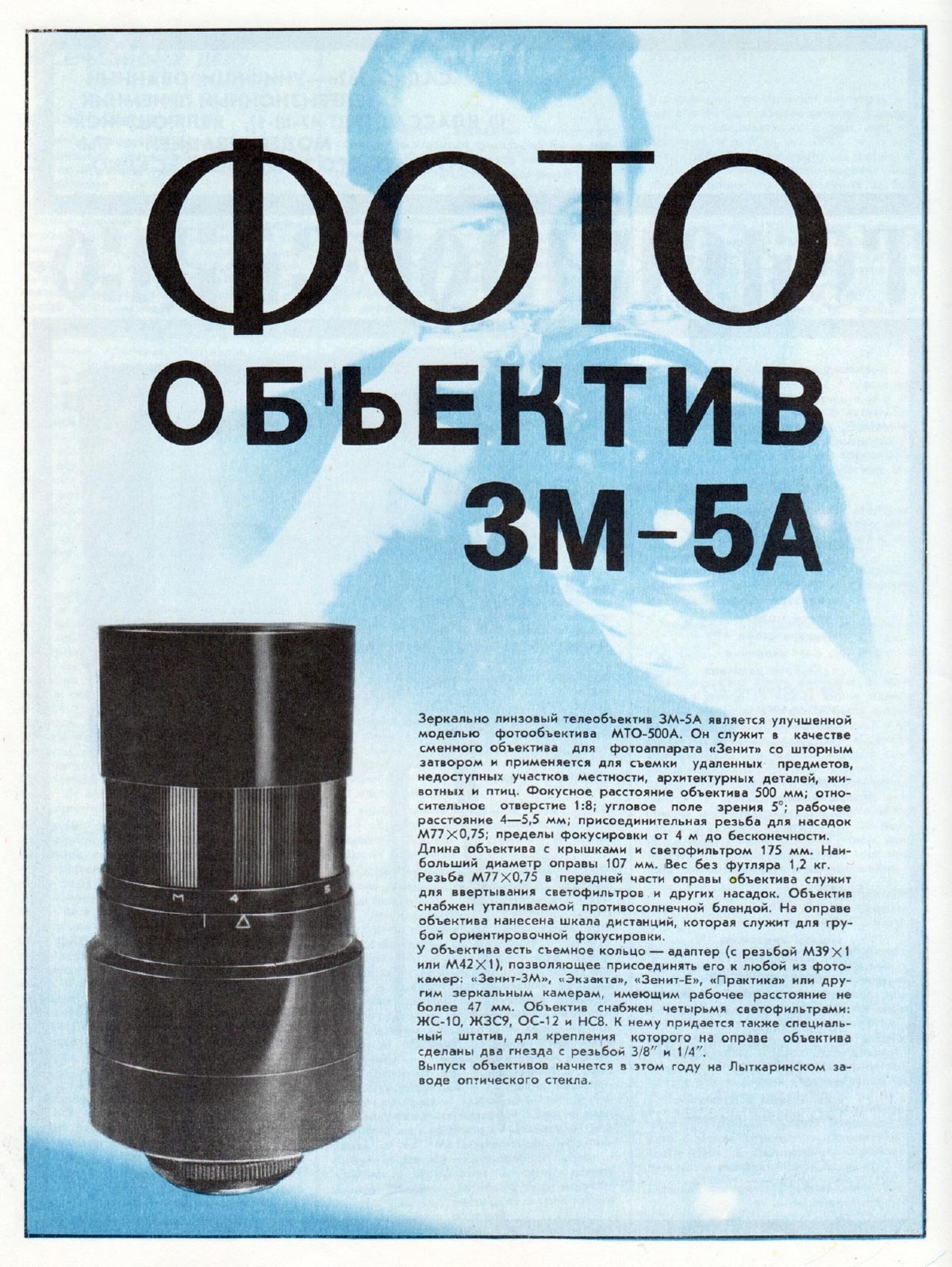 Объектив "ЗМ-5А" с 1967 года выпускал Лыткаринский завод оптического стекла. Для 35-мм зеркальных фотоаппаратов. Позиционировался как объектив для профессиональной астрофотосъёмки и фотоохоты.