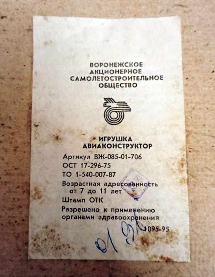 Игрушка "Авиаконструктор" производился возможно с 1996 года Воронежским акционерным самолётостроительным обществом. Авиаконструктор предназначен для сборки моделей самолётов детьми 7...11 лет.