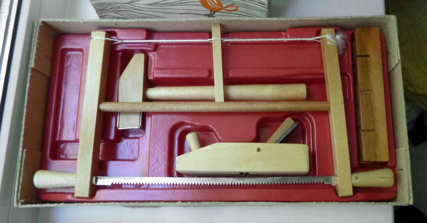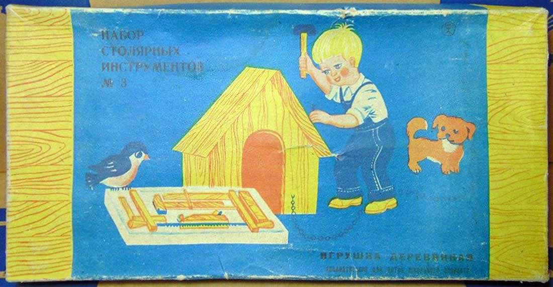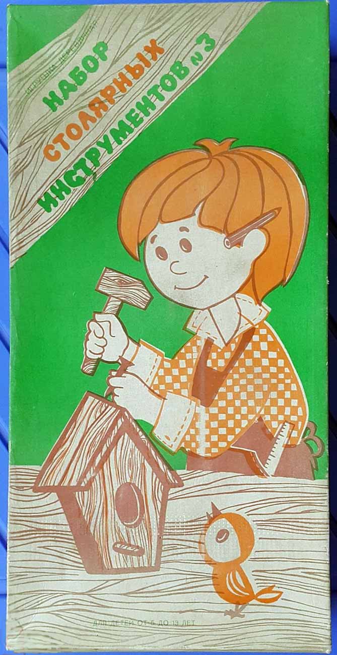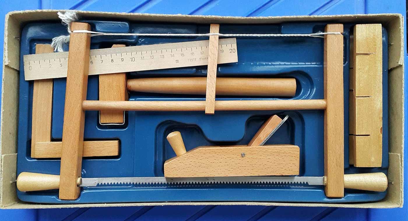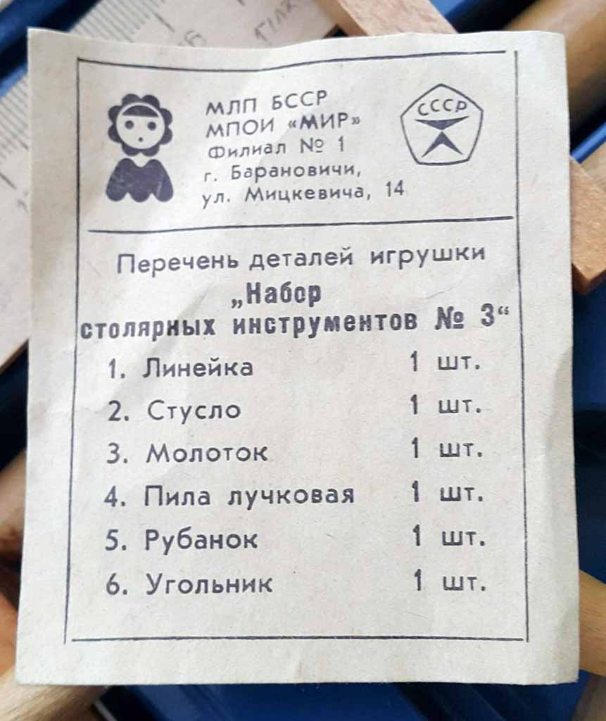 Игрушка деревянная "Набор столярных инструментов № 3" производился предположительно с 1980 года МПОИ "МИР", Барановичи, БССР. Предназначен для детей 5-13 лет для изготовления поделок из дерева.